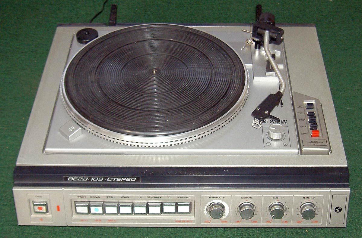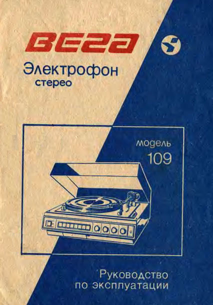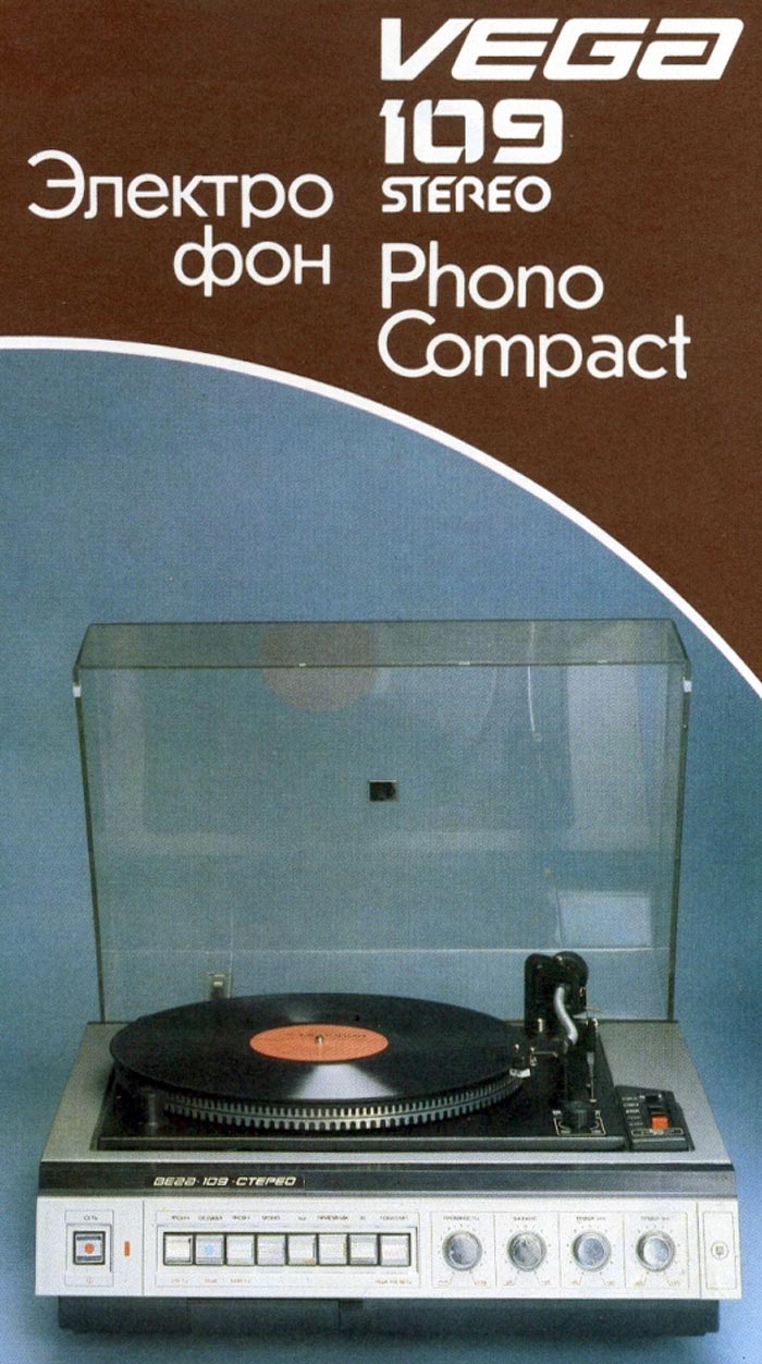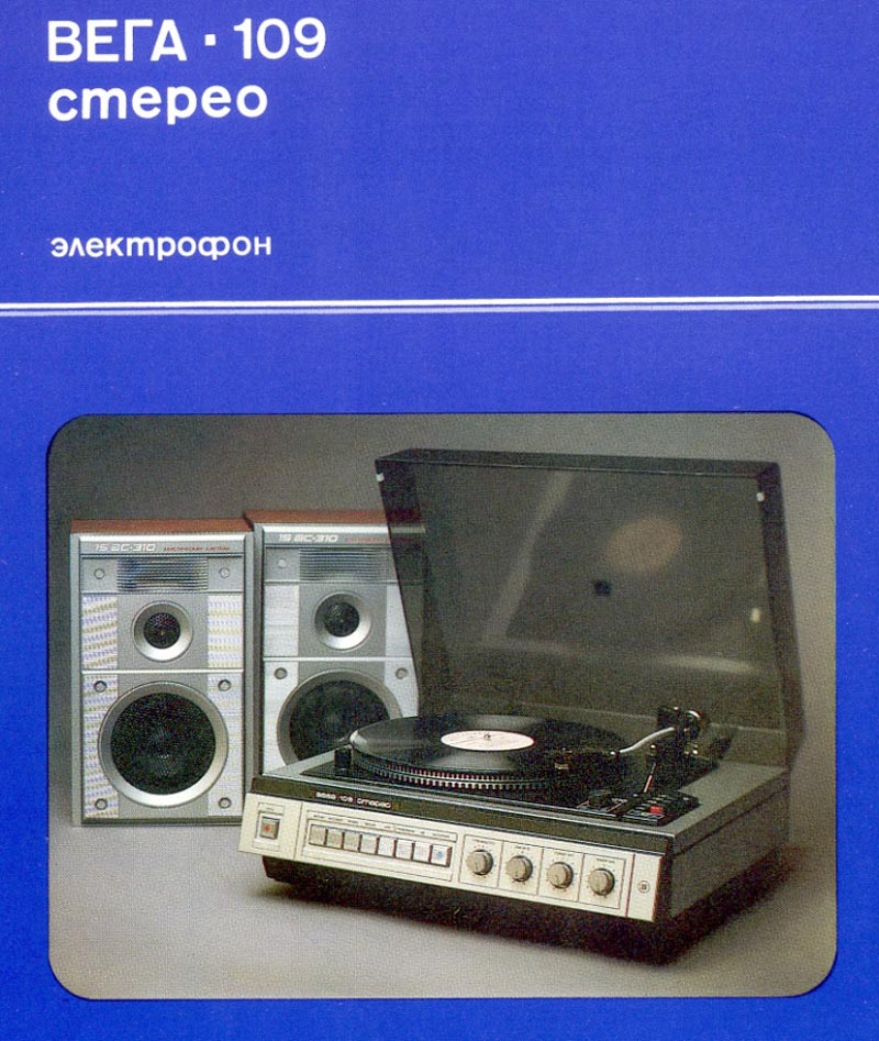 Электрофон сетевой транзисторный *Вега-109-стерео* с 1985 года выпускал Бердский радиозавод. Электрофон имеет двухскоростное ЭПУ - G-602-С производства ПНР, раздельные регуляторы тембра НЧ, ВЧ, регулятор стереобаланса, фильтры НЧ и ВЧ, отключаемую тонкомпенсацию, ступенчатый регулятор громкости, регулировку частоты вращения диска со стробоскопом, автостоп, микролифт. В комплект электрофона входят две АС 15АС-109. Номинальная выходная мощность 2х10 Вт. Диапазон воспроизводимых частот звука - 50...18000 Гц. Потребляемая мощность 80 Вт. Уровень фона, минус 50 дБ. Коэффициент детонации ЭПУ 0,15 %. Тип звукоснимателя MF-101. Габариты электрофона - 465х210х428 мм. Габариты одной АС 360х220х190 мм. Масса электрофона 15 кг, масса одной АС 7 кг.