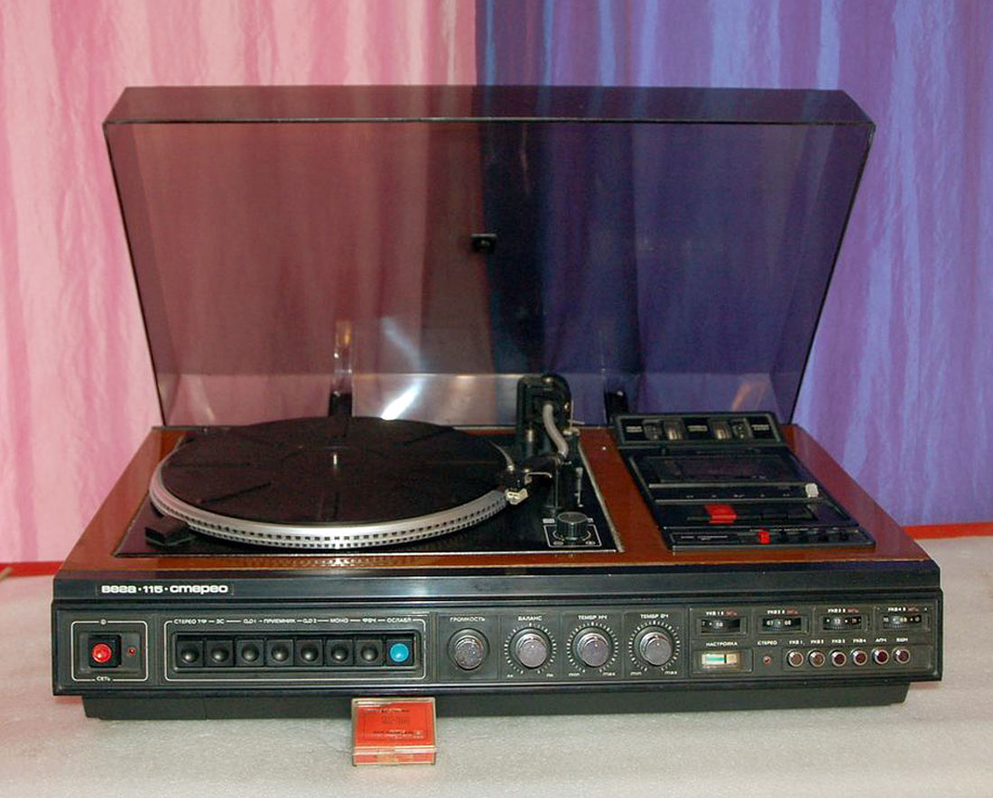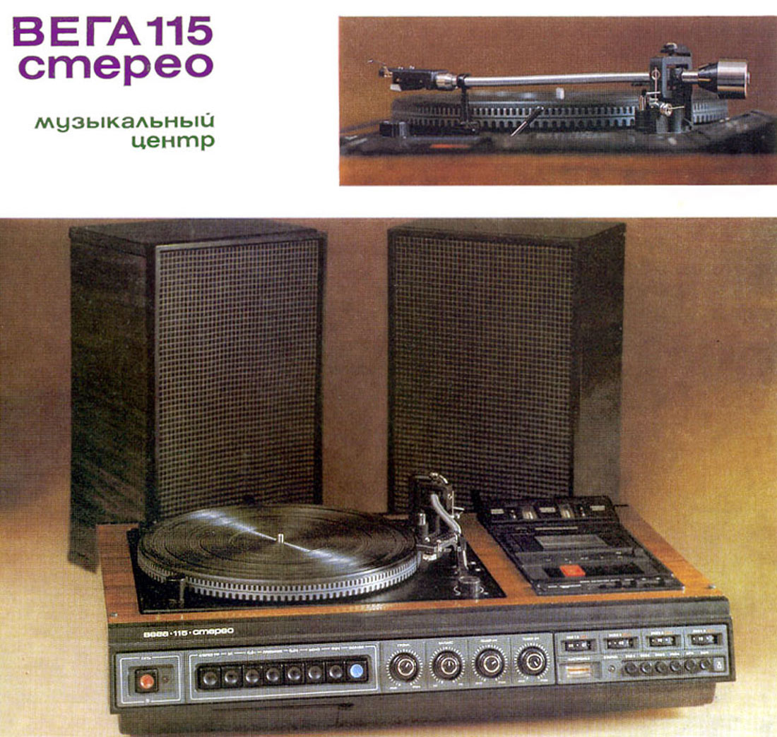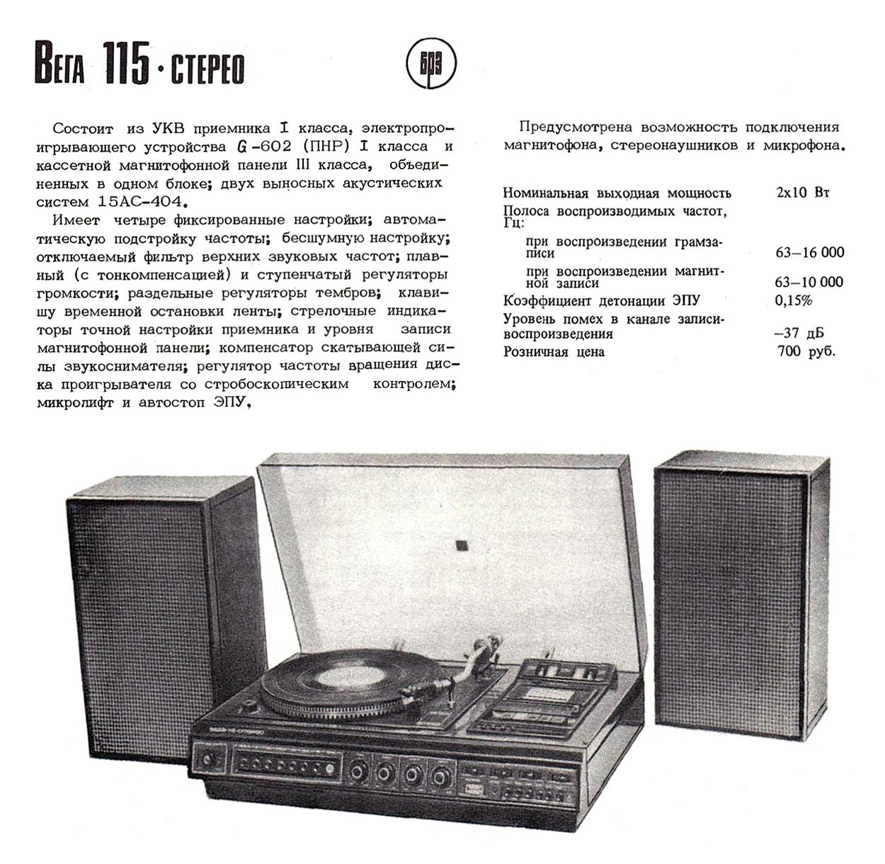 Комбинированное устройство *Вега-115-стерео* с 1978 года выпускал Бердский радиозавод. КУ предназначено для высококачественного воспроизведения моно и стерео магнитофонных и граммофонных записей, приёма моно и стерео ЧМ радиостанций. КУ включает в себя ЭПУ с электромагнитной головкой, микролифтом, автостопом, утяжеленным диском, подстройкой частоты вращения и стробоскопическим контролем, кассетную стереофоническую двухдорожечную МП, имеющую регуляторы уровня записи со стрелочными индикаторами. КУ имеет АПЧ, блок фиксированных настроек, БШН, сквозной стереотракт, выносные АС. Есть возможность подключения внешнего тюнера, магнитофона, микрофона, стереотелефонов. Чувствительность тюнера 4 мкВ. Диапазон рабочих частот - 4,56...4,11 МГц. Номинальная выходная мощность 2х10 Вт. Полоса воспроизводимых звуковых частот с ЭПУ - 31,5...16000 Гц. Питание: сеть с напряжением 110, 127, 220 или 240 В. Габариты основного блока - 610 х 420 х 210 мм, АС - 420 х 250 х 190 мм. Масса комплекта 38 кг. Цена КУ с АС - 700 рублей.