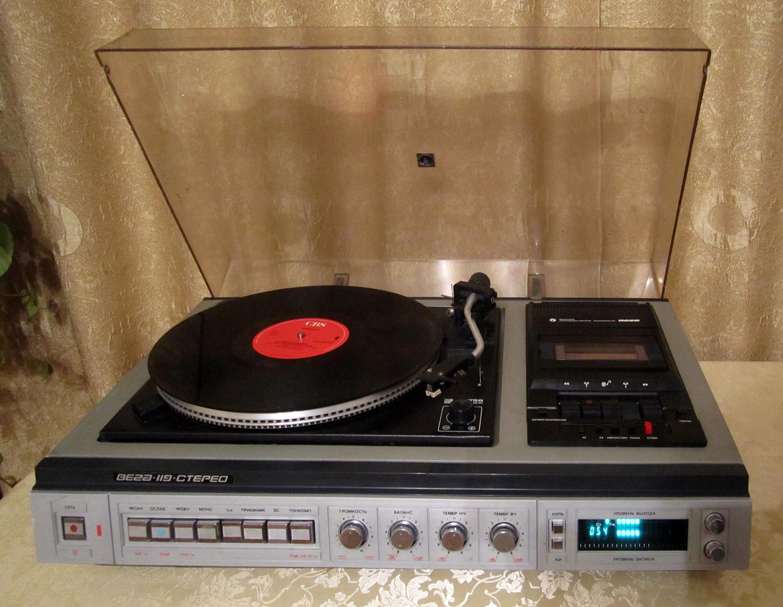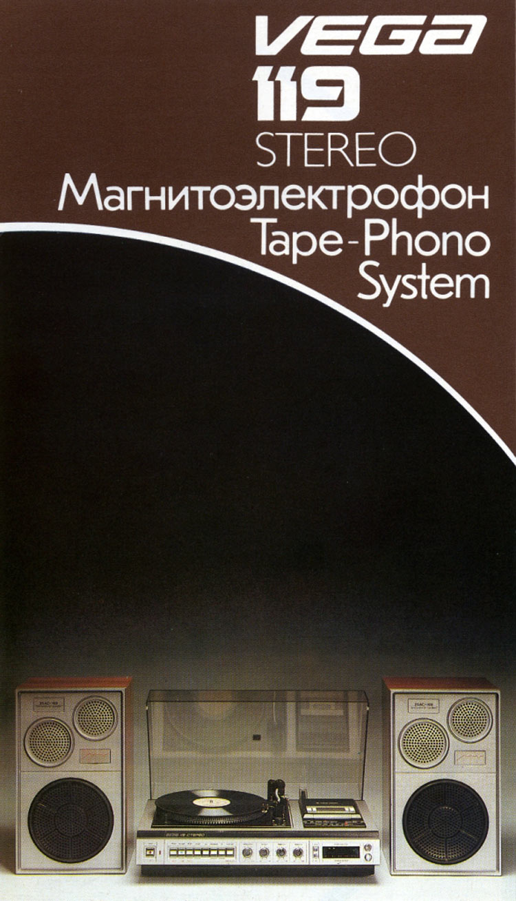 Комбинированное устройство - магнитоэлектрофон *Вега-119-стерео* с начала 1986 года выпускало Бердское ПО Вега. Магнитоэлектрофон состоит из ЭПУ G-602С, кассетной магнитофонной панели, усилителя, объединенных в одном блоке и двух акустических систем 25 АС-109. КУ имеет систему шумопонижения, поиска фонограмм по паузам, фильтры ВЧ и НЧ, отключаемую тонкомпенсацию, временный стоп ЛПМ, электронный счетчик расхода ленты, электронный индикатор для уровня записи и воспроизведения, регулятор частоты вращения диска со стробоскопом, компенсатор скатывающей силы звукоснимателя, микролифт и автостоп для проигрывателя. ЛПМ типа СМ-1 (Венгерская НР) однодвигательный, пермаллоевая головка работа с двумя типами магнитной ленты. Номинальная выходная мощность усилителей 2х10 Вт. Диапазон воспризводимых звуковых частот при работе ЭПУ не уже 31,5....18000 Гц. Диапазон воспризводимых звуковых частот при работе магнитофона 40...14000 Гц. Потребляемая от электрической сети мощность 80 Вт. Наружные габариты магнитоэлектрофона 610х210х428 мм. Габариты одной акустической системы - 285х480х253 мм. Масса магнитоэлектрофона около 20 кг. Масса одной акустической системы 12 кг.