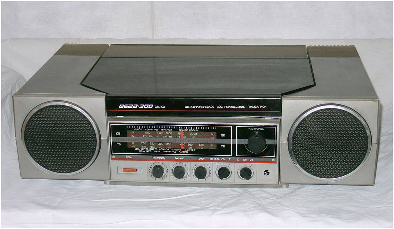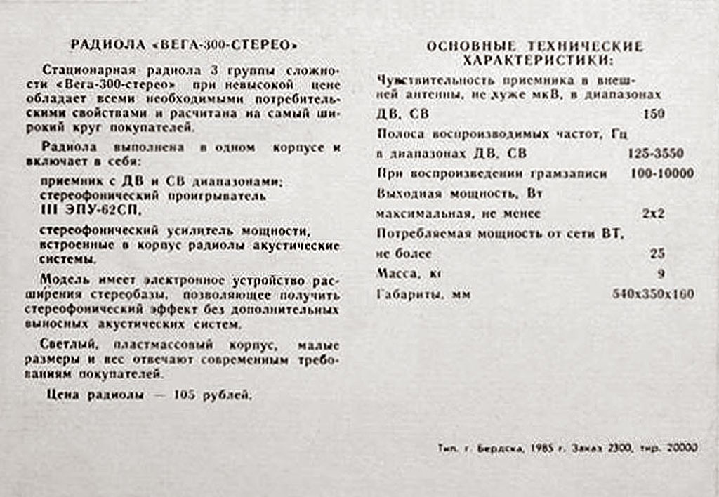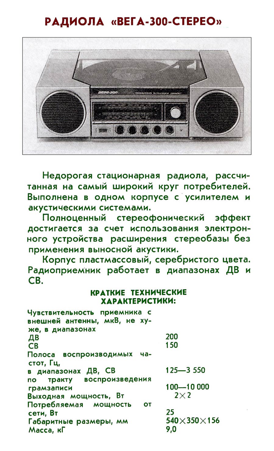 Стационарная транзисторная радиола 3-го класса *Вега-300-стерео* с 1986 года выпускалась Бердским радиозаводом. Радиола состоит из приёмного устройства, рассчитанного на приём программ радиостанций в диапазонах ДВ и СВ, электропроигрывающего устройства *II-ЭПУ-62СП*, усилителя ЗЧ и встроенных АС. В радиоле имеется электронная система для расширения стереобазы. Чувствительность приёмника в диапазонах: ДВ - 200 мкВ, СВ - 150 мкВ. Номинальная выходная мощность - 2х2 Вт. Диапазон воспроизводимых частот при приёме 125...З550 Гц, работе ЭПУ 100...10000 Гц. Потребляемая сети мощность 25 Вт. Габариты радиолы - 540х350х156 мм. Масса 9 кг.