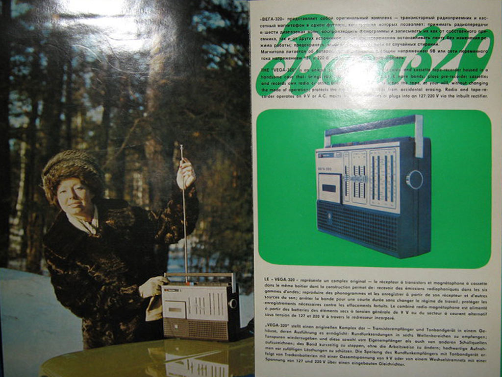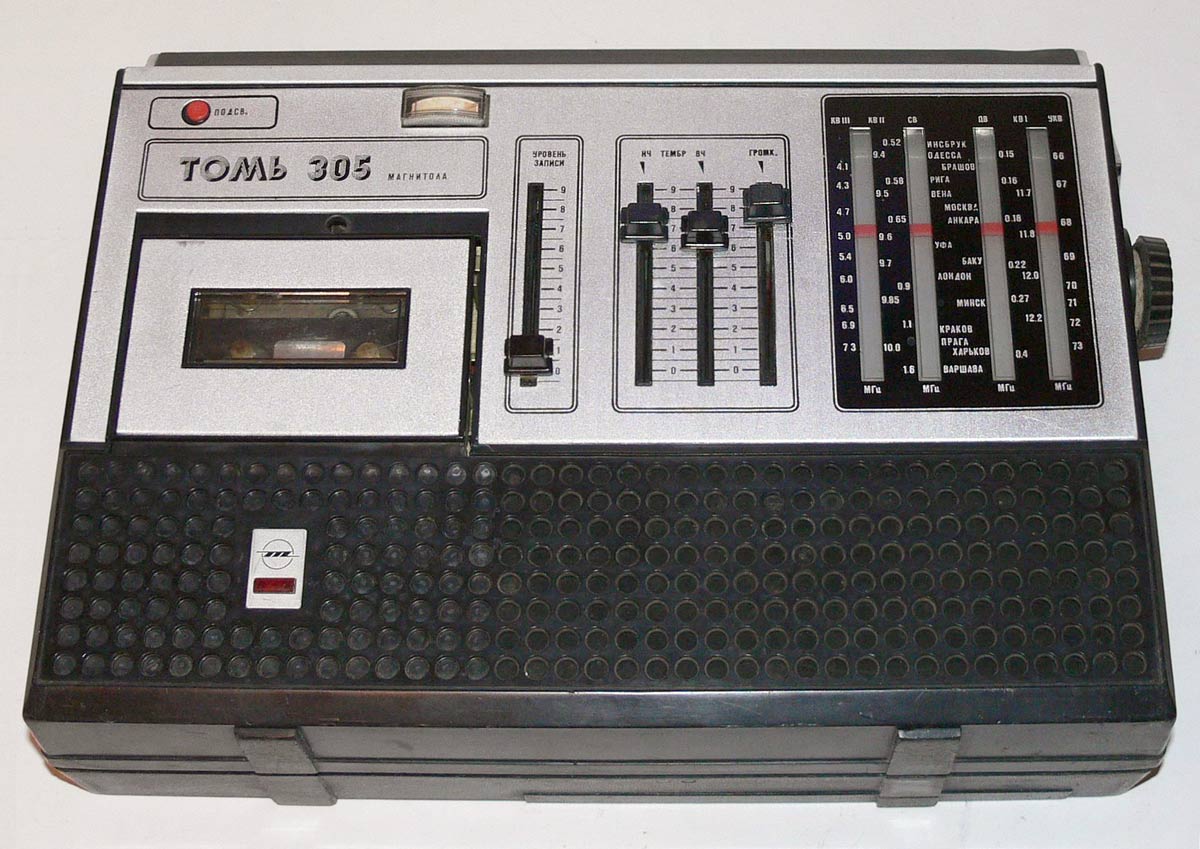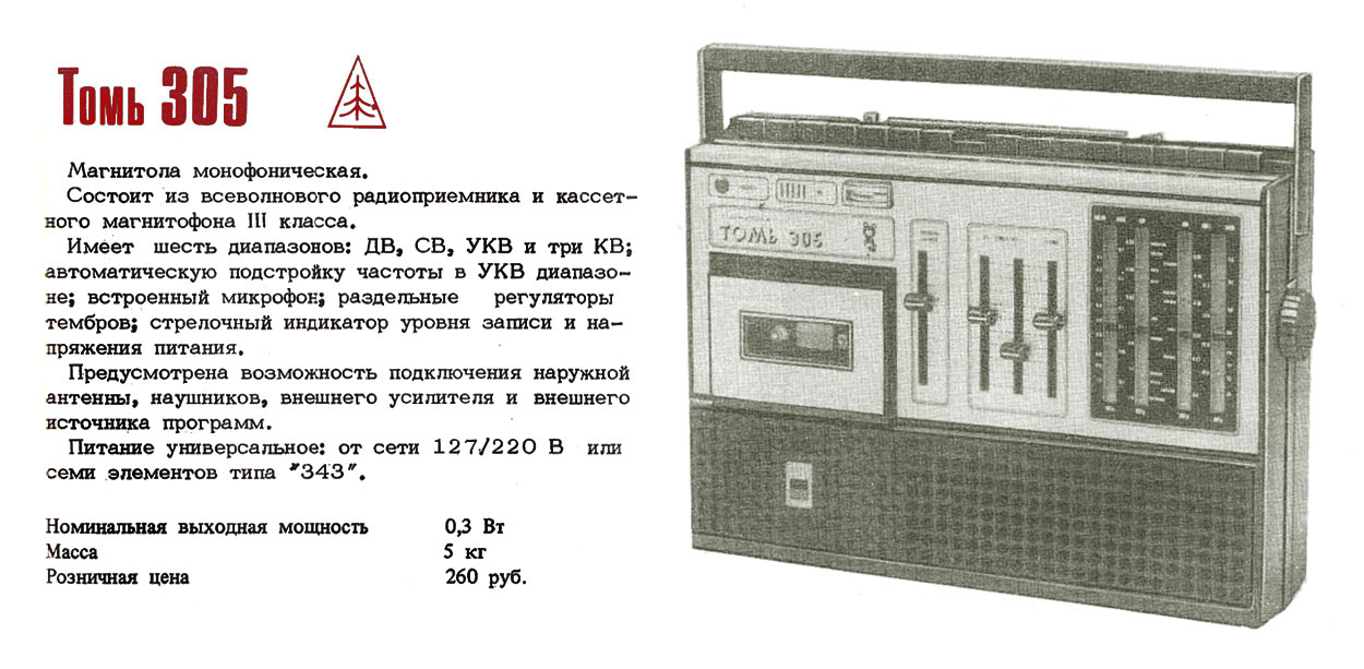 Кассетные магнитолы *Вега-320* и *Томь-305* соответственно с 1976 и 1977 года выпускали Бердский радиозавод и Томский радиотехнический завод. Магнитолы по схеме и конструкции одинаковы и разработаны на базе модели **Форум-301**. Магнитолы состоят из всеволновых шестидиапазонных приёмников и односкоростных магнитофонных панелей III класса типа МП-305 производства Томского РТЗ. В отличие от базовой модели, в усилителе ПЧ AM тракта магнитол используются не резонансные контуры, а пьезокерамический фильтр; двухкаскадный УПЧ совмёщенного AM-ЧМ тракта дополнен каскадом на микросхеме с новой цепью АРУ. В усилитель НЧ введены раздельные регуляторы тембра по ВЧ и НЧ и добавлен каскад НЧ на 2-х транзисторах. Для питания от сети магнитолы имеют встроенные выпрямители. Магнитофонные панели рассчитаны для работы со стандартной кассетой МК-60. Скорость протяжки магнитной ленты 4,76 см/с, коэффициент детонации 0,4%. Относительный уровень помех в канале воспроизведения -43 дБ. В магнитолах установлены динамические головки 1ГД-37 вместо 0,5ГД-30, которые применялись в магнитоле **Форум-301**. Номинальная выходная мощность магнитол 0,3 Вт, максимальная 0,8 Вт. Диапазон частот звука на линейном выходе 63...10000 Гц, а диапазон частот воспроизводимых встроенным громкоговорителем при работе магнитофона и приёмника в диапазоне УКВ - 200...7100 Гц. В остальных диапазонах 200...3550 Гц. Наружные габариты любой из магнитол 300х375х100 мм, вес не более 5 кг. Розничная цена 230 рублей.
