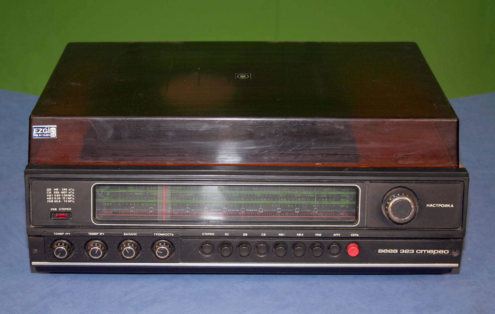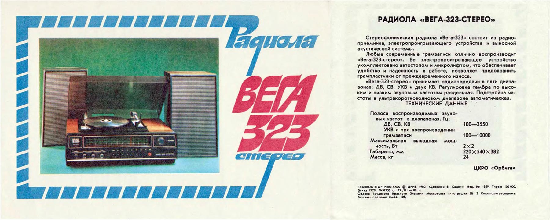 Стереофоническая радиола 3-го класса *Вега-323-стерео* с 1979 года выпускалась Бердским радиозаводом. Радиола предназначена для приёма в диапазонах: ДВ, СВ, КВ, УКВ и прослушивания грампластинок. Радиола состоит из приемника, ЭПУ и 2-х выносных АС. Тембр по ВЧ и НЧ регулируется раздельно. Подстройка частоты в УКВ диапазоне автоматическая. Радиола имеет индикатор наличия стереопередачи. Радиолу выпускали с двух и трёхгодичным гарантийным сроком и соответственно с различной розничной ценой. Полоса воспроизводимых звуковых частот в диапазонах ДВ, СВ, KB - 100...3550 Гц, на УКВ или при воспроизведении грамзаписи - 100...10000 Гц. Максимальная выходная мощность - 2х2 Вт. Потребляемая мощность 30/40 Вт. Габариты радиолы 220х540х382 мм. Масса 24 кг.