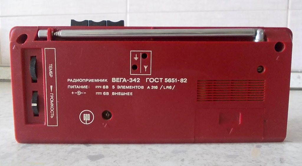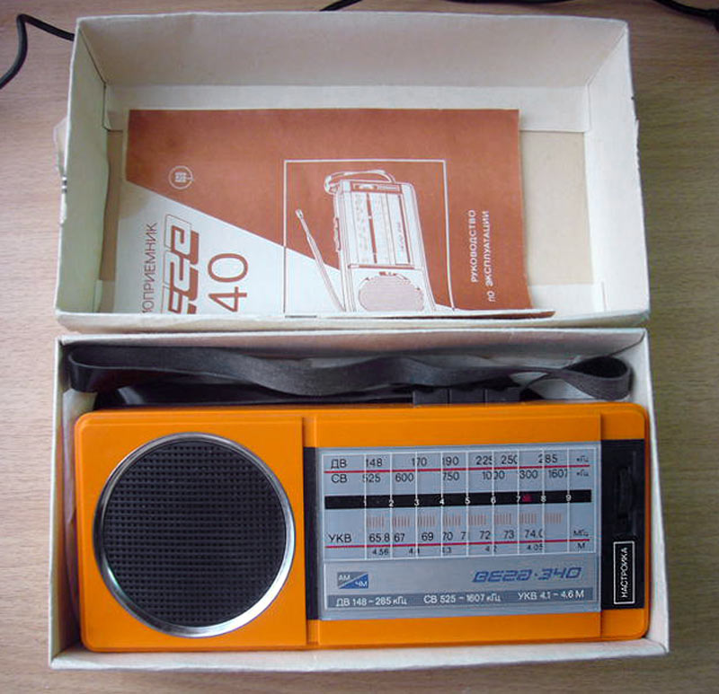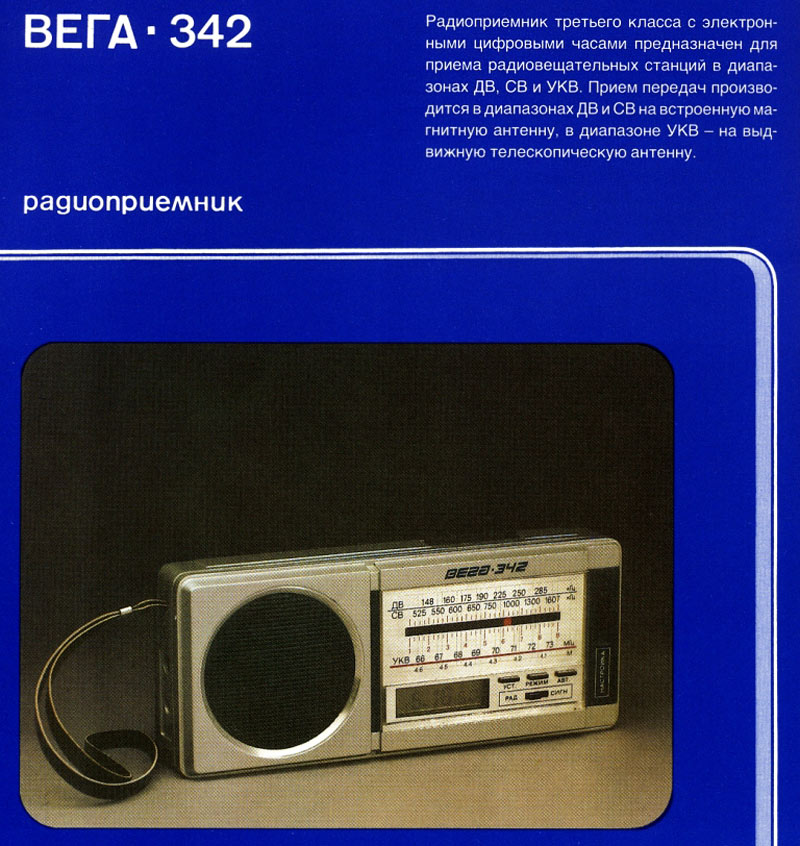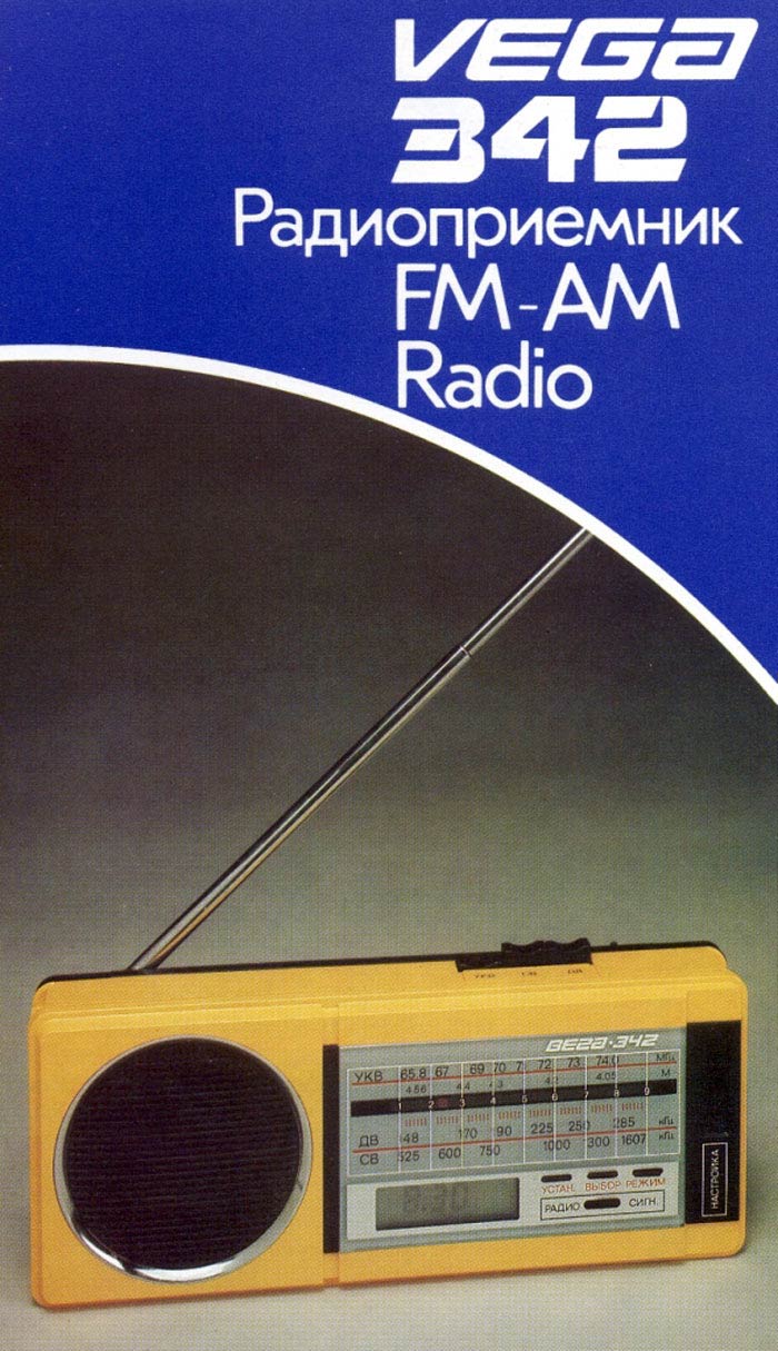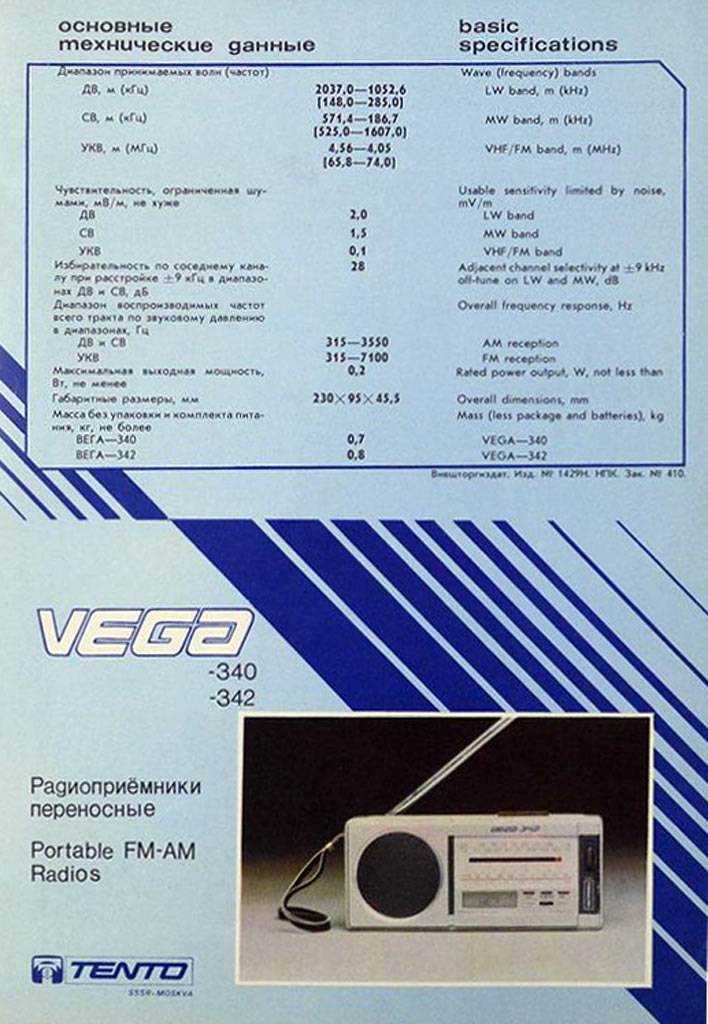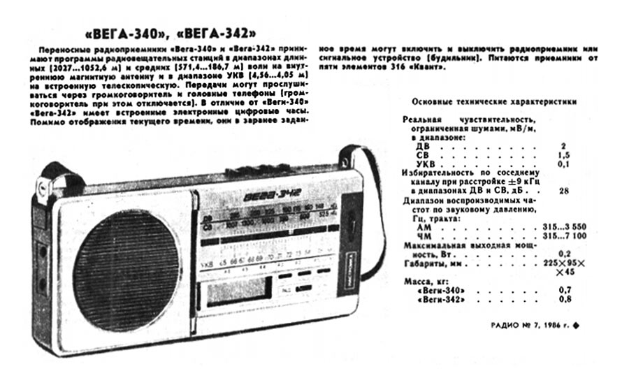 Портативные радиоприёмники "Вега-340", "Вега-342" выпускал Бердский радиозавод с 1986 года. Радиоприёмники *Вега-340* и *Вега-342* принимают программы радиовещательных станций в диапазонах ДВ и СВ на встроенную магнитную антенну, а в диапазоне УКВ-ЧМ на встроенную телескопическую. Передачи можно слушать и на головные телефоны, при этом громкоговоритель отключается. В отличие от приёмника **Вега-340**, приёмник **Вега-342** имеет электронные цифровые часы. Помимо отображения текущего времени они в заранее заданное время могут включить и выключить приёмник или сигнальное устройство - будильник. Питание приёмников осуществляется от 5 элементов 316. Основные характеристики: Реальная чувствительность в диапазонах: ДВ - 2, СВ - 1,6, УКВ - 0,1 мВ/м. Селективность в АМ - 28 дБ. Диапазон воспроизводимых звуковых частот в ДВ и СВ диапазонах - 315...3550 Гц, в УКВ диапазоне - 315...7100 Гц. Номинальная выходная мощность - 0,2 Вт. Габариты РП - 230х95х45,5 мм, Масса 700 гр. На базе модели "Вега-342" другой завод выпускал приёмник - "Электроника-304".