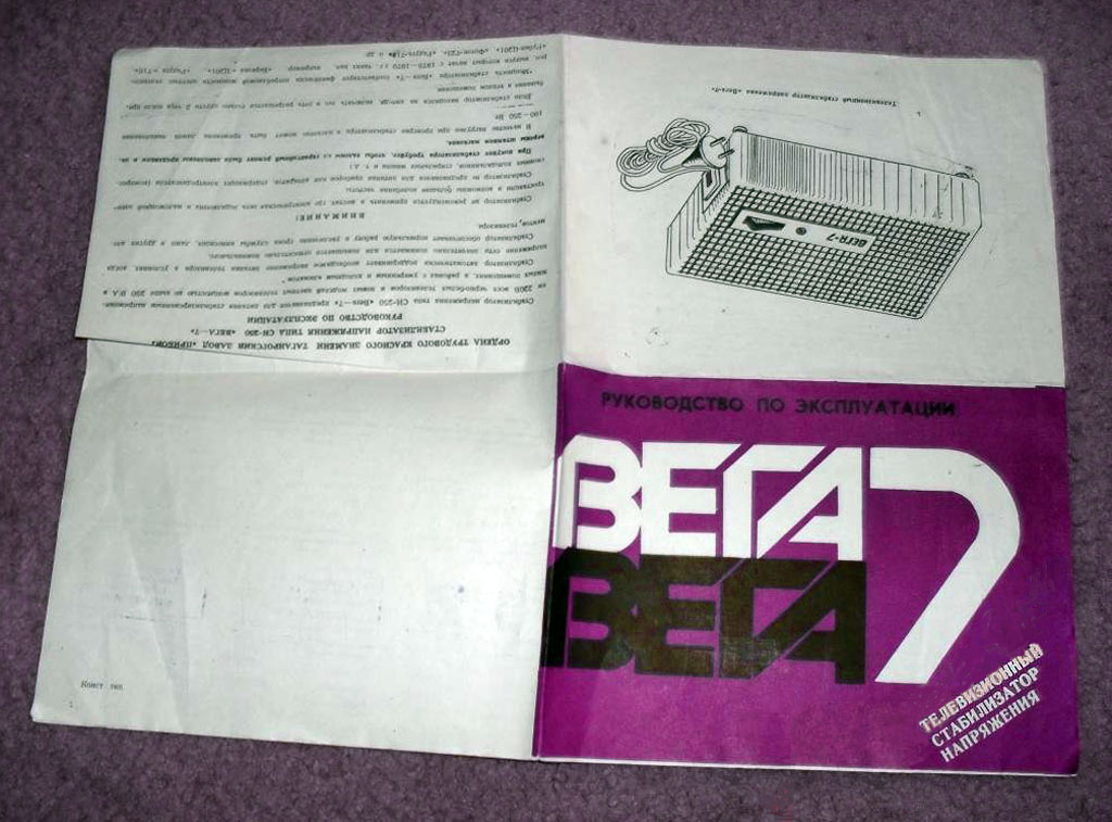 Стабилизатор напряжения *Вега-7* предположительно с 1984 года выпускал Таганрогский завод *Прибой*. Стабилизатор предназначен для питания стабилизированным напряжением 220 вольт телевизоров с потребляемой мощностью не более 250 Вт. Подробнее о стабилизаторе в инструкции.
