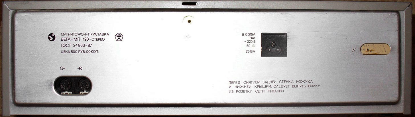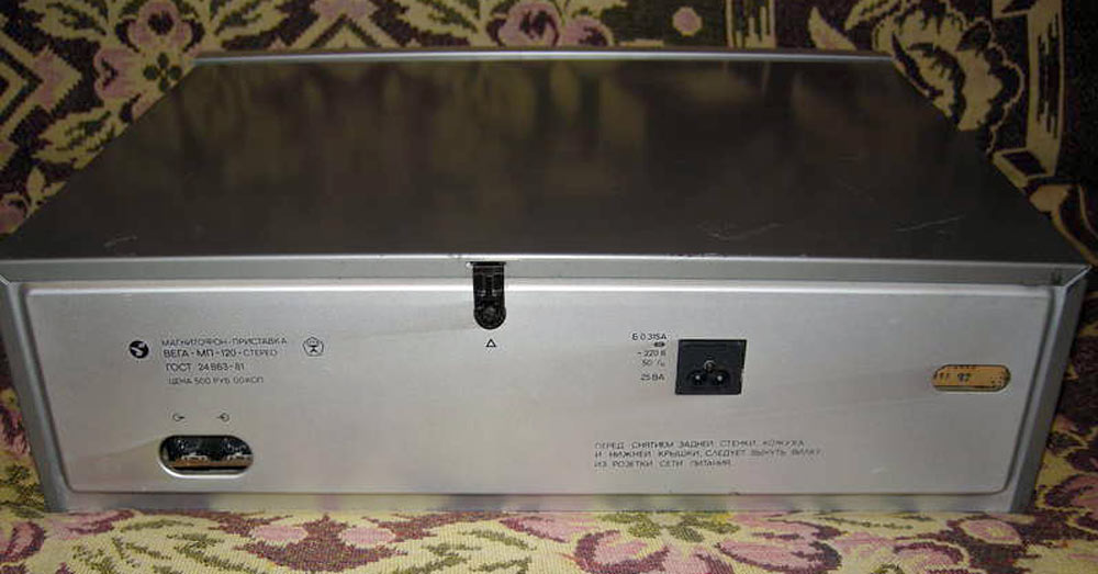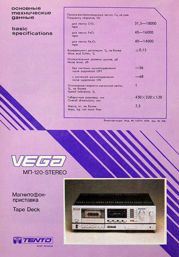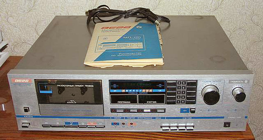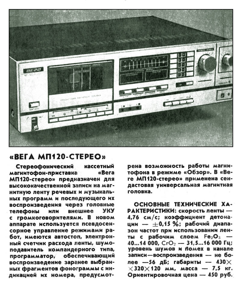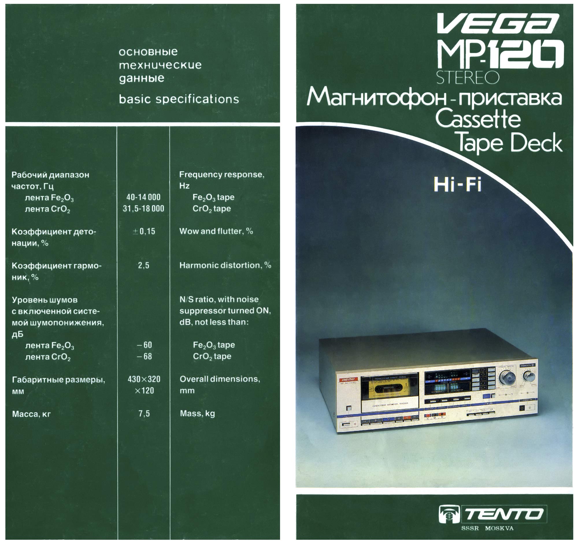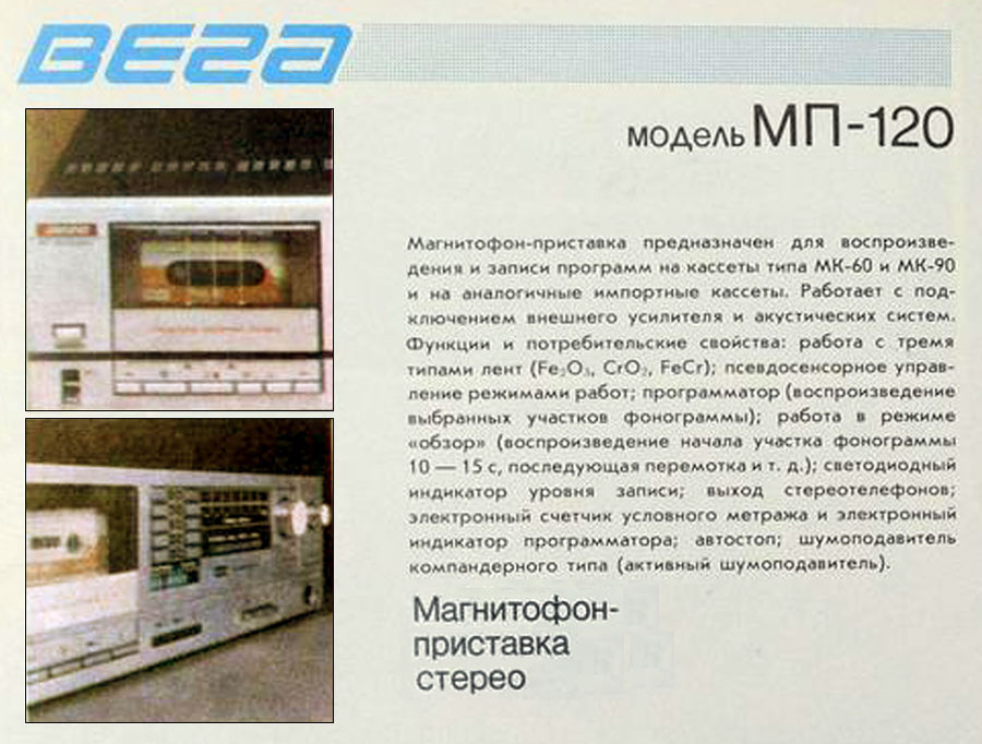 Магнитофон-приставка *Вега МП-120-стерео* с 1987 года выпускало Бердское ПО *Вега*. Предназначена для записи фонограмм на магнитную ленту и их воспроизведения через стереофонические головные телефоны и внешнее УКУ. В модели применены: псевдосенсорное управление режимами работ, автостоп, электронный счетчик расхода ленты, компандерный шумоподавитель, программатор для воспроизведения заранее выбранных фрагментов, с индикацией их номера, есть режим *Обзор*. В аппарате применена сендастовая магнитная головка. Коэффициент детонации 0,15%. Диапазон звуковых частот на ленте Fe - 40..14000, Cr - 31,5..16000 Гц. Уровень шумов и помех в канале записи и воспроизведения -56 дБ. Габариты МП 430х320х120 мм, вес 7,5 кг.