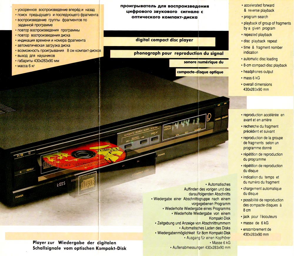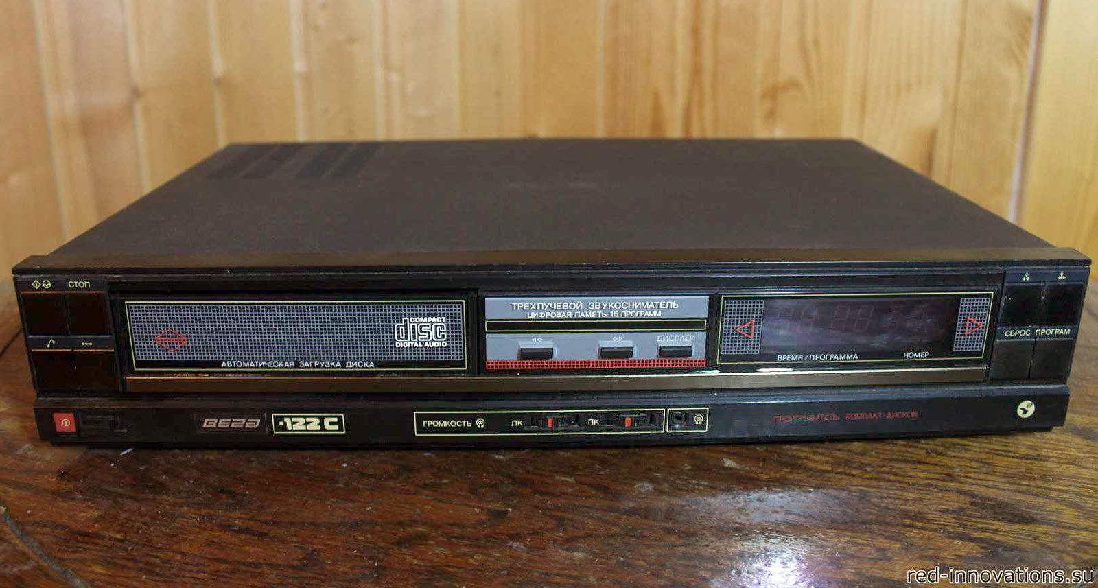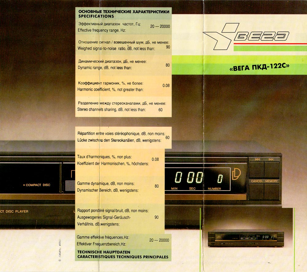 Проигрыватель компакт-дисков "Вега ПКД-122С" с 1991 года выпускал Бердский радиозавод. ПКД предназначен для воспроизведения цифрового сигнала с лазерных компакт дисков и преобразования его в сигнал звуковой частоты. ПКД имеет: устройство для выбора и воспроизведения фонограмм по заданной программе; узел автоматического поиска предыдущей и последующих фонограмм; индикаторы режимов работы. Диапазон рабочих частот 20...20000 Гц, КНИ - 0,08%. Отношение сигнал/взвешенный шум 90 дБ. Разделение между стереоканалами 60 дБ. Потребляемая мощность 12 Вт. Габариты ПКД - 430х285х110 мм. Масса 6,1 кг. ПКД входил в комплекс "Вега-122С", но продавался и отдельно.