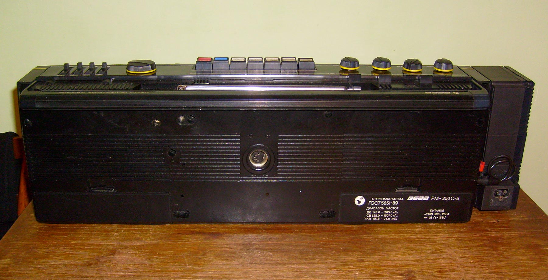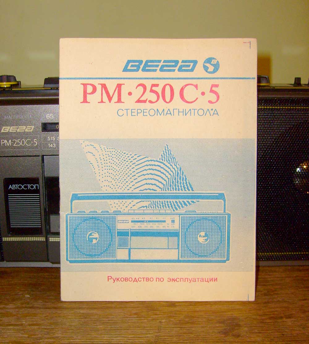 Переносная стереофоническая магнитола *Вега РМ-250С-5* с 1995 года выпускало Бердское ПО *Вега*. Предназначена для приёма в диапазонах ДВ, СВ, УКВ (стерео), магнитной записи и воспроизведения звука на ленте МЭК-I. Магнитола имеет: неотключаемую АПЧ в диапазоне УКВ; АРУЗ; автоматическую остановку ЛПМ по окончании ленты; динамический шумоподавитель при воспроизведении. Модель производит моно и стереофоническую записи со своего приёмника и внеших источников. Питание от 6 элементов 373 и от сети с помощью выносного БП. Диапазон частот по звуковому давлению в диапазонах ДВ, СВ 160...4000 Гц; УКВ 160...10000 Гц. Частотный диапазон на ЛВ магнитофонной панели 40...12500 Гц. Максимальная выходная мощность 2х4 Вт; музыкальная 2х8 Вт. Габариты магнитолы 466x153x110 мм. БП 46x140x75 мм. Масса без БП и батарей 3,1 кг. Масса блока питания 0,75 кг.