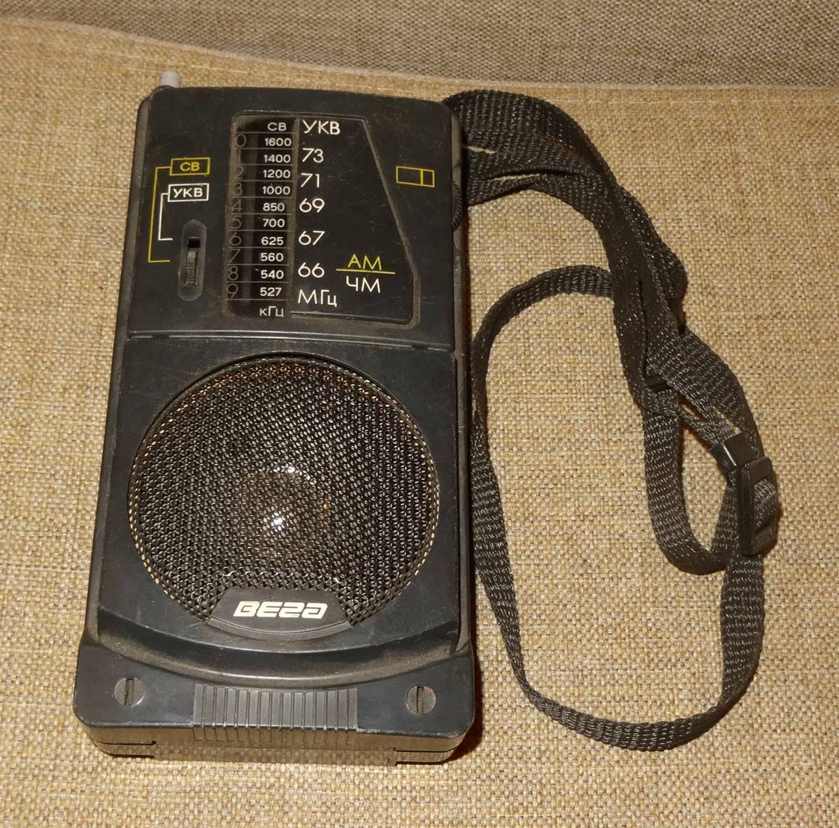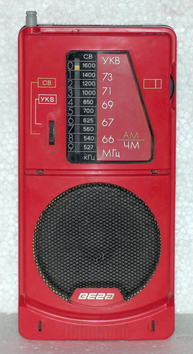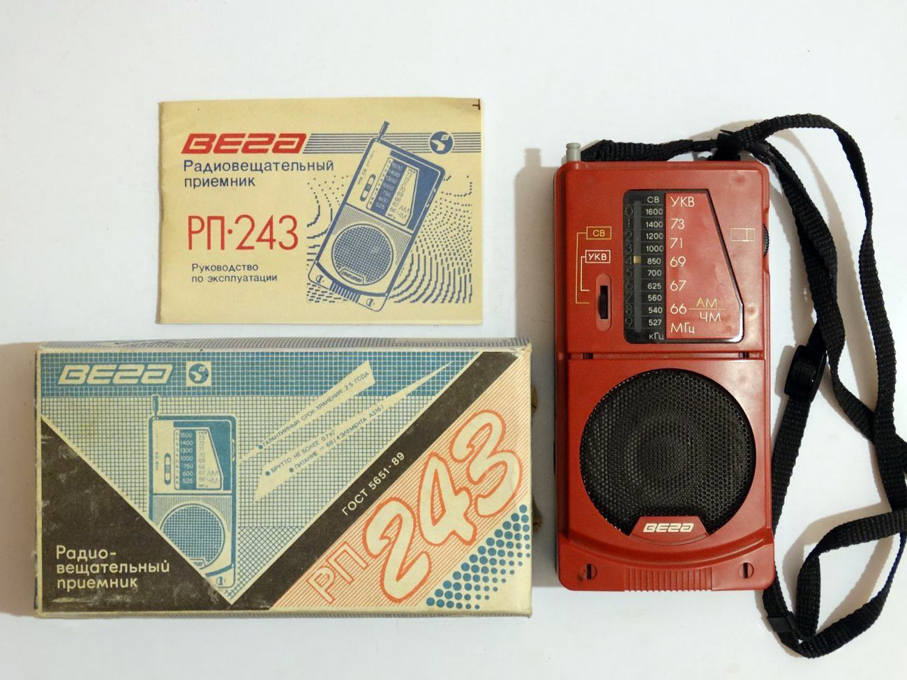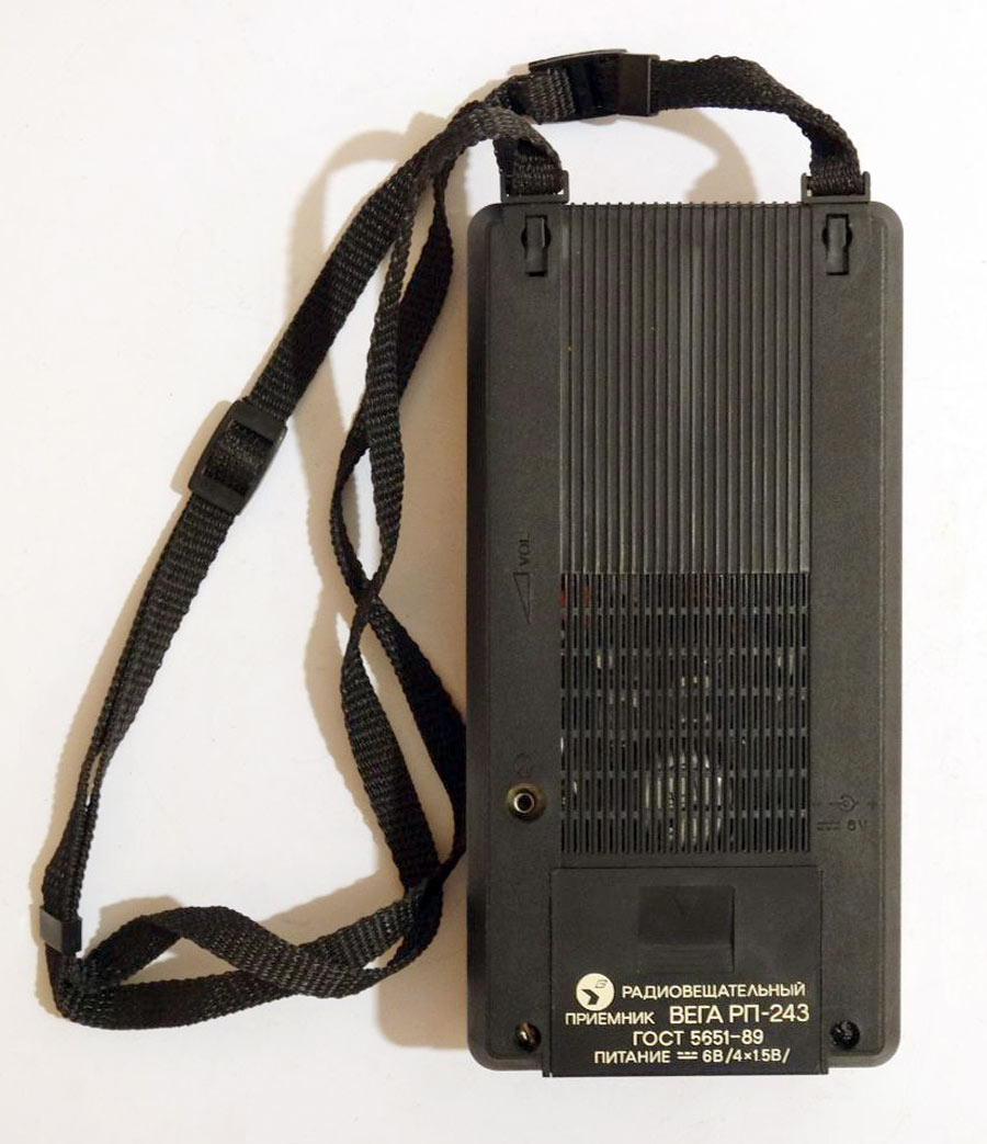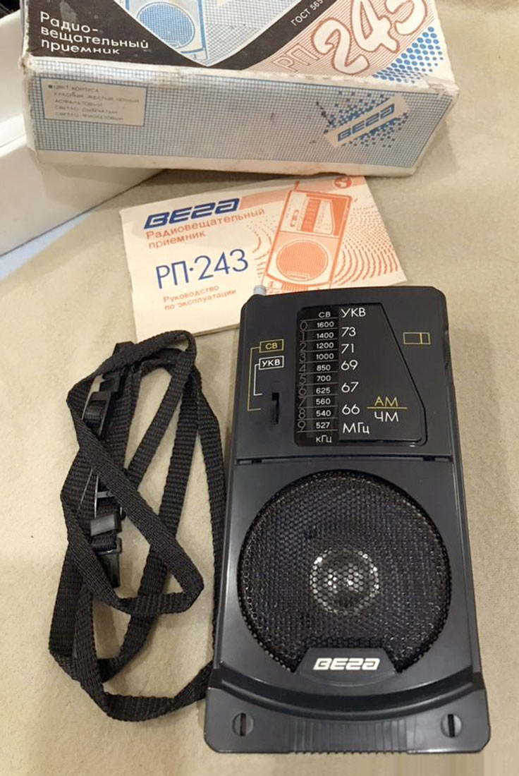 Портативный АМ/ЧМ радиоприёмник *Вега РП-243* с начала 1989 года выпускал Бердский радиозавод. Радиоприёмник рассчитан для приёма программ радиовещательных станций в диапазонах средних (СВ) и ультракоротких (УКВ) волн. Радиоприёмник собран на двух микросхемах и трёх транзисторах. Чувствительность в диапазоне СВ - 1,3 мВ/м, УКВ - 100 мкВ. Селективность 30 дБ. Диапазон эффективно воспроизводимых звуковых частот при приёме в ЧМ - 250...7000 Гц, АМ - 300...40000 Гц. Номинальная выходная мощность - 100 мВт. Питание от 4-х элементов А-316. Масса радиоприёмника - 350 гр.