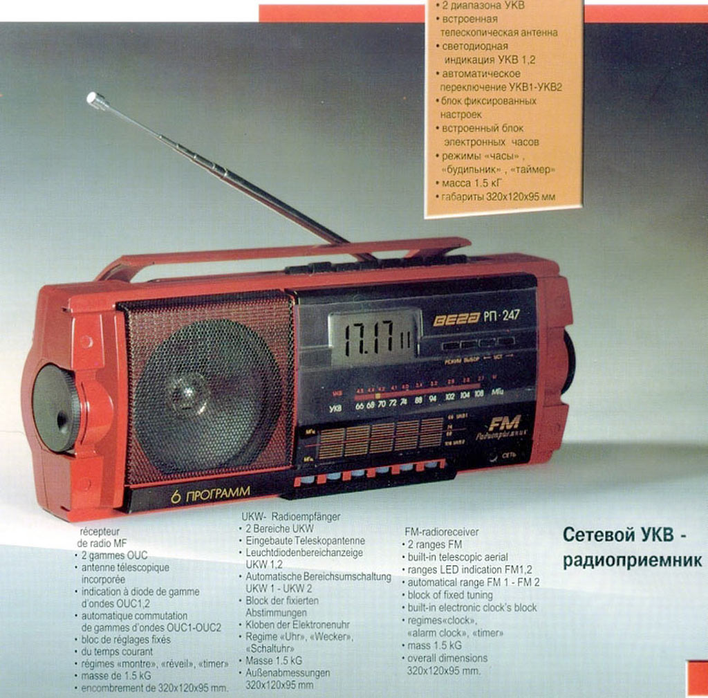 Стационарный транзисторный радиоприёмник *Вега РП-247* подготовило к выпуску с 1995 года Бердское АООТ *Вега*. Сетевой радиоприёмник **Вега-247** предназначен для приёма вещательных радиостанций в двух УКВ диапазонах, отечественном 65,8...74 МГц и европейском 87,5...108 МГц. В приёмнике имеются встроенные электронные часы с функцией таймера и будильника. Кроме этого радиоприёмник имеет следующий набор эксплутационных и сервисных удобств: светодиодную индикацию включенного диапазона, автоматическое переключение диапазонов при переходе указателя настройки на соответствующую частоту, блок фиксированных настроек, для беспоискового включения любой из 6 заранее настроенных радиостанций, индикацию включения в сеть, возможность приёма с помощью выдвижной телескопической или внешней антенны. Чувствительность в обоих УКВ диапазонах 50 мкВ. Диапазон воспроизводимых частот по звуковому давлению 315...8000 Гц. Максимальная выходная мощность 1 Вт. Габариты радиоприёмника 320х120з95 мм. Масса 1,5 кг. Серийно радиоприёмник *Вега РП-247* не выпускался.