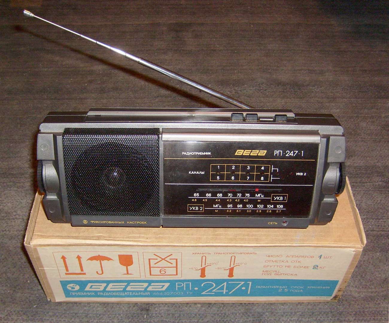 Переносной радиоприёмник *Вега РП-247-1* с 1995 года выпускало Бердское АООТ *Вега*. Приёмник **Вега-247-1** схож с сетевой моделью *Вега РП-247*, отличаясь отсутствием электронных часов и автономным питанием. Приёмник предназначен для приёма радиостанций с ЧМ в двух диапазонах УКВ и имеет: Индикацию включения в сеть. Регулировку громкости. Плавную настройку. Фиксированные настройки на 8 радиостанций. Индикацию включенного диапазона и фиксированных настроек. Диапазоны: УКВ-1 65,8...74,0 МГц. УКВ-2 95,0...108,0 МГц. Чувствительность, ограниченная шумами в диапазонах: УКВ-1 5 мкВ, УКВ-2 7 мкВ. Максимальная выходная мощность при питании от сети 1 Вт. Габариты приёмника 320х122,5х90,5 мм. Масса без батарей 1,5 кг. Приёмник выпускался в 2 вариантах оформления.
