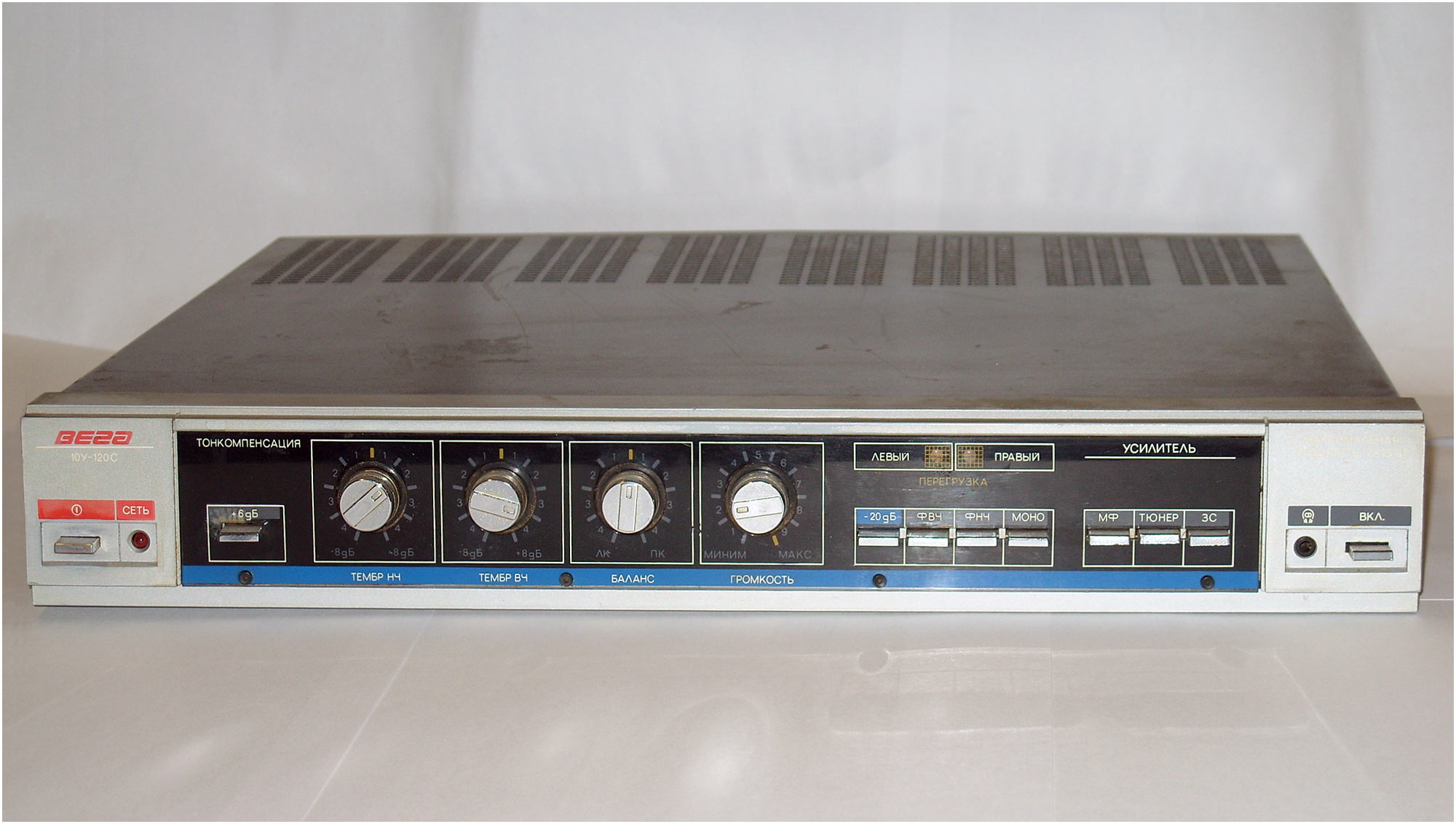 Усилитель *Вега У-120-стерео* с I-кв 1987 года выпускал Бердский радиозавод. **Вега У-120-стерео**, позднее **Вега 10У-120-стерео** - полный усилитель 1-й группы сложности. Он предназначен для усиления сигналов от различных источников. Усилитель имеет: коммутацию входов источников программ; регулировку тембров ВЧ и НЧ, громкости и стереобаланса; ступенчатое изменение громкости; включение фильтров ВЧ и НЧ; индикаторы сети и перегрузки. Усилитель имеет входы звукоснимателя, магнитофона, тюнера, АС и телефонов. Диапазон рабочих частот 20..20000 Гц. Номинальная выходная мощность 2х10 Вт. Потребляемая мощность 44...120 Вт. Габариты 430х70х360 мм. Масса 7 кг.