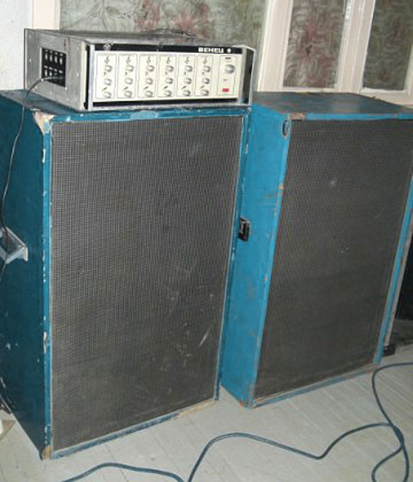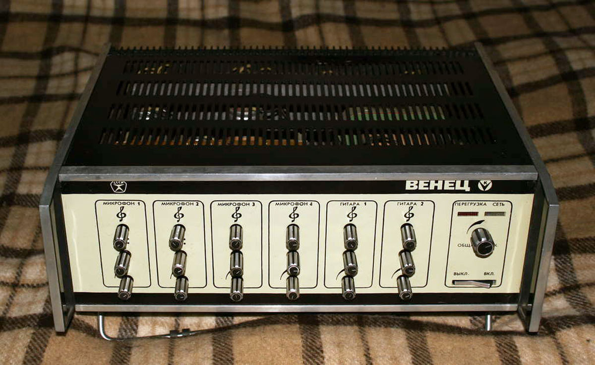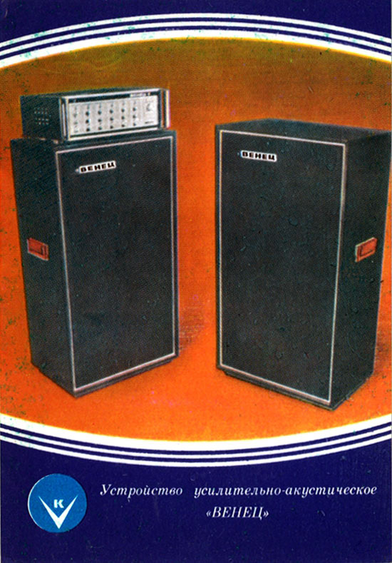 Устройство усилительно-акустическое *Венец* выпускалось предположительно с 1985 года. Усилитель*Венец предназначен для усиления сигналов от микрофонов, электрогитар, электроорганов, синтезаторов, магнитофонов и других источников. Он рассчитан на работу в составе эстрадных музыкальных ансамблей. Устройство состоит из монофонического усилителя НЧ и двух громкоговорителей (акустических систем), в каждом из которых установлено по две динамических головки типа *4А-32* и четыре динамические головки *3ГД-38*. Усилитель имеет четыре микрофонных входа, два входа для подключения электрогитар и два универсальных входа для других источников сигнала. На каждый из шести первых входов, предусмотрена регулировка уровня громкости, а так же тембра по высшим и низшим звуковым частотам. В усилителе предусмотрена электронная защита от короткого замыкания в нагрузке, имеется индикатор перегрузки, позволяющий следить за режимом его работы. Технические параметры: номинальная выходная мощность 100 Вт; диапазон частот усилителя 30...20000 Гц; КНИ не более 1%; диапазон регулировки тембра ±12 дБ; перегрузочная способность по всем входам 16 дБ; потребляемая мощность 170 Вт.
