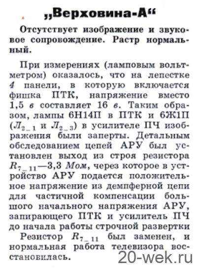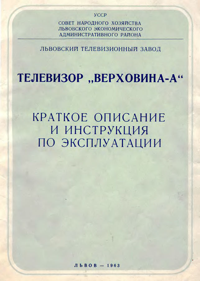 Телевизионный приёмник чёрно-белого изображения *Верховина-А* с 1962 года выпускал Львовский телевизионный завод. Телевизор имеет 16 ламп, 9 п/п диодов, кинескоп 43ЛК2Б и представляет собой модернизированную модель телевизора **Верховина**. Изменения направлены на повышение его эксплуатационной надежности. Размер изображения 270 х 360 мм. Чувствительность в 100 мкВ позволяет вести уверенный приём на наружную антенну передач в радиусе до 70 км от студии. Громкоговорители 1ГД-9 и 2ГД-3, расположенные на передней панели и на боковой стенке обеспечивают громкое звучание. Применение систем АРУ, АРЯ и схемы инерционной синхронизации с АПЧ и Ф упростило обращение с телевизором. Несимметричное расположение экрана, применение пластмассы, в сочетании с деревянным футляром с отделкой ценными породами дерева или имитацией придают телевизору красивый вид. В зависимости от отделки на телевизор установлены две цены. Основные регулировки аппарата выведены на лицевую панель. Вспомогательные находятся сзади. Монтаж элементов на платах печатный. Потребляемая мощность 180 Вт. Габариты ТВ - 570 х 400 х 330 мм. Масса 29 кг. Всего телевизоров **Верховина-А** выпущено ~ 70 тысяч штук. Радио №2/1965, ст. 57 Радио №4/1965, ст. 30 Радио №4/1966, ст.26 Через 5—7 мин после включения нарушается синхронизация по строкам. Вращая ручку регулятора частоты строк, можно добиться восстановления нормального изображения, но через 1 — 1,5 мин строчная синхронизация вновь нарушается. Такие признаки неисправности появляются тогда, когда конденсатор С4_2о—8200 пф в фильтре системы АПЧ и Ф имеет утечку. Для устранения неисправности следует заменить этот конденсатор. Радио №9/1966, ст.39