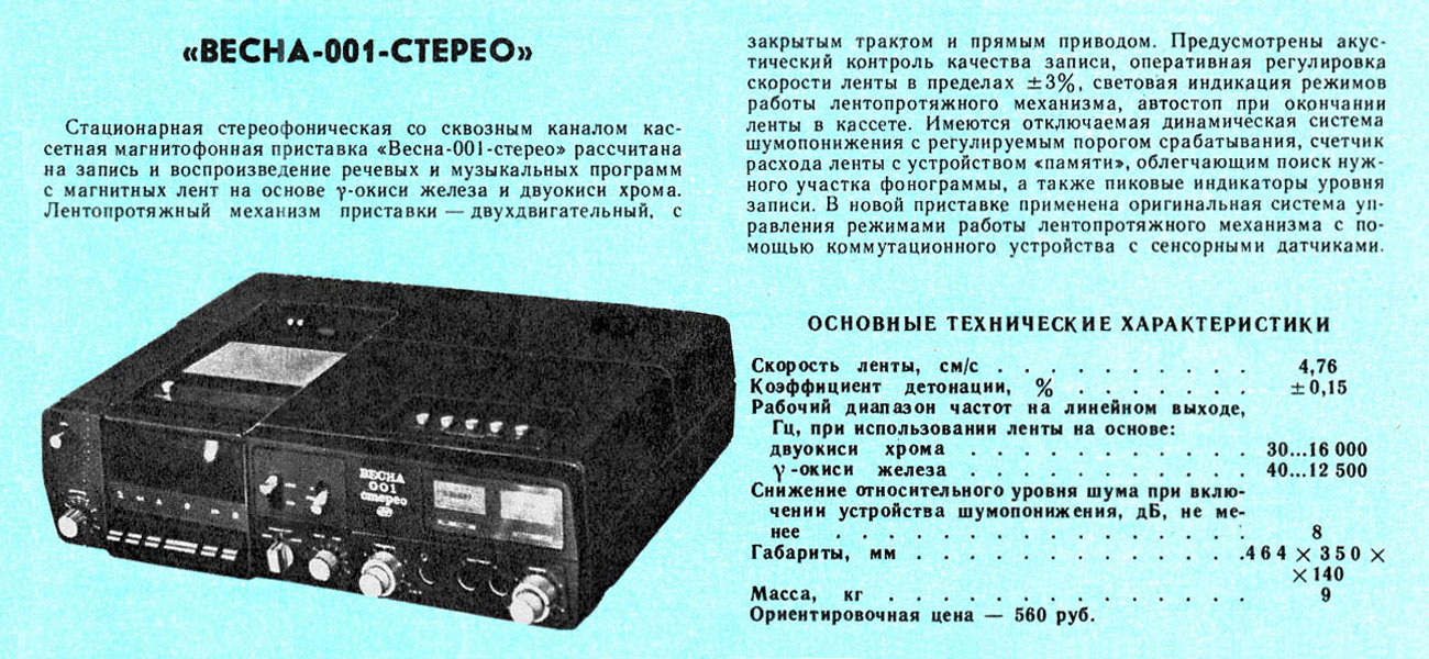 Кассетная магнитофонная приставка *Весна-001-стерео* в 1980 году опытно выпущена Запорожским электромашиностроительным заводом *Искра*. Стационарная стереофоническая, со сквозным каналом кассетная магнитофонная приставка высшего класса **Весна-001-стерео** рассчитана на запись и воспроизведение речевых и музыкальных программ с магнитных лент на основе окиси железа и двуокиси хрома. ЛПМ мг-приставки двухдвигательный с закрытым трактом и прямым приводом. Предусмотрены акустический контроль записи, оперативная регулировка скорости протяжки ленты, световая индикация режимов работы ЛПМ, автостоп при окончании ленты в кассете. В МП имеются отключаемая динамическая система шумопонижения с регулируемым порогом срабатывания, счетчик расхода ленты с устройством память, облегчающим поиск нужного места фонограммы, а также пиковые индикаторы уровня записи звука. В модели применена оригинальная система управления режимами ЛПМ с помощью коммутационного устройства с сенсорными датчиками. Скорость протяжки магнитной ленты 4,76 см/с. Коэффициент детонации ±0,15%. Рабочий диапазон звуковых частот на линейном выходе при использования ленты на основе двуокиси хрома не хуже 30...16000 Гц, окиси железа 40...12500 Гц. Снижение уровня шума при включении устройства шумопонижения -8 дБ. Потребляемая от элекрической сети мощность 40 Вт. Габариты аппарата 464х350х140 мм. Масса 9 кг.
