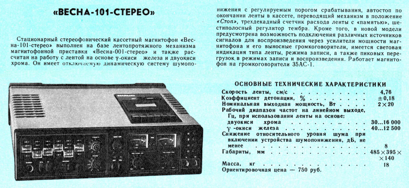 Стереофонический кассетный магнитофон *Весна-101-стерео* опытно выпущен в 1980 году Запорожским электромашиностроительным заводом *Искра*. Он выполнен на базе ЛПМ магнитофона-приставки **Весна-001-стерео** и работает с магнитной лентой из окиси железа и двуокиси хрома. Модель имеет отключаемую динамическую систему шумопонижения с регулируемым порогом срабатывания, автостоп по окончании ленты, трёхдекадный счетчик по расходу магнитной ленты с режимом память, шестиполосный регулятор тембра. Кроме того, имеется возможность подключения различных источников сигналов для воспроизведения через усилители магнитофона и его выносные АС, есть световая индикация типа магнитной ленты, режима записи, пиковых перегрузок, в режимах записи и воспроизведения. Работает магнитофон *Весна-101-стерео* на две акустические системы **35АС-1**. Скорость протяжки ленты 4,76 см/сек. Коэффициент детонации 0,18%. Номинальная выходная мощность - 2х20 Вт. Диапазон рабочих частот на линейном выходе при использовании магнитной ленты на основе двуокиси хрома 30...18000 Гц, окиси железа 40..12500 Гц. Снижение уровня шума при включении шумопонижения 8 дБ. Размеры магнитофона 485х395х140 мм. Его вес 18 кг.