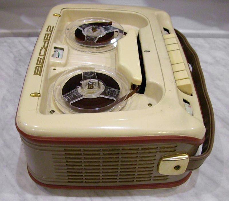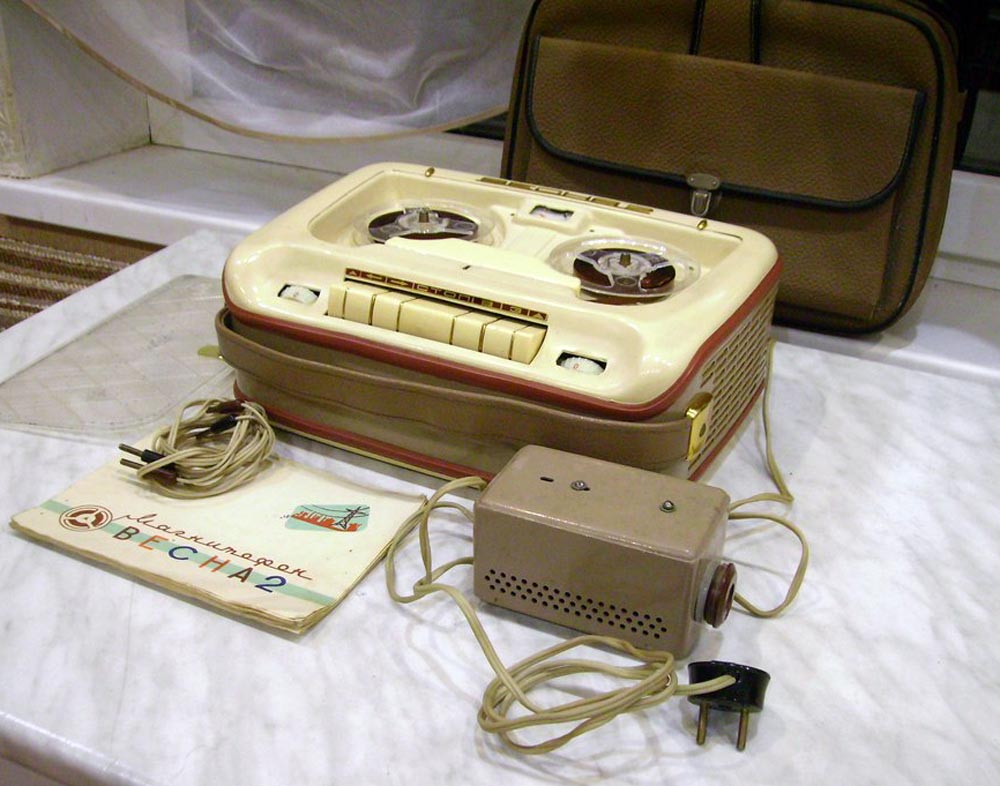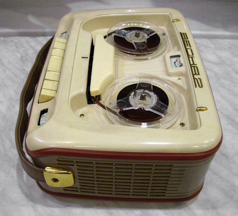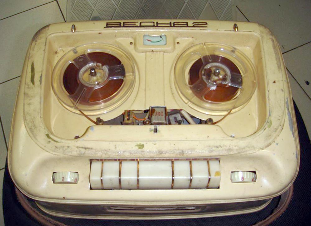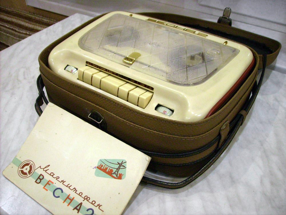 Портативные магнитофоны *Весна* и *Весна-2* с 1963 и 1964 года выпускали Киевский завод *Коммунист* и Запорожский завод передвижных электростанций. **Весна** двухдорожечный переносной магнитофон с универсальным питанием. Катушки вмещают 100 м. магнитной ленты типа 2 (6). Скорость ЛПМ - 9,53 см/сек. Есть ускоренная перемотка ленты. Диапазон частот воспроизводимых громкоговорителями 1ГД-9 - 100...6000 Гц. Номинальная выходная мощность 1 Вт. Питание от 10 элементов А-373, внешнего источника 12 В и от сети через выпрямитель. Магнитофон собран в корпусе из металла. В нём применено 11 транзисторов и 5 диодов. Габариты магнитофона 340х250х130 мм. Масса 5,5 кг. Магнитофон по оформлению почти не отличается от базового, но есть изменения в схеме. Установлены новые громкоговорители 1ГД-18, в связи с чем при снижении выходной мощности до 0,8 Вт, улучшилась экономичность, увеличилось звуковое давление и повышен диапазон частот на ЛВ от 63 до 10000 Гц, а воспроизводимых громкоговорителями от 100 до 10000 Гц. Другие параметры остались такими же как у базового магнитофона.