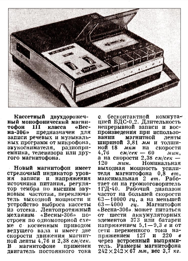 Кассетный магнитофон *Весна-306* с 1972 года выпускал Запорожский ЭМЗ *Искра* и его один филиал. Магнитофон зарекомендовал себя, как один из лучших отечественных кассетных магнитофонов в своём классе. В магнитофоне использован оригинальный ЛПМ с косвенным приводом ведущего вала, работающий от нового бесконтактного электродвигателя. От всех других кассетных ЛПМ его отличает наличие 2-х маховиков, связанных общим пассиком, что исключает колебания скорости магнитной ленты при работе в транспорте и на ходу. Конструкция узла перемотки с фрикционным роликом исключает обрыв магнитной ленты и обеспечивает надежное сцепление с маховиком, а так же с подающим и приёмным узлами при перемотке. К достоинствам следует отнести и чёткую фиксацию кассеты, что делает неизменной АЧХ. В ЛПМ имеется устройство блокировки записи. Электрическая часть магнитофона выполнена на современных транзисторах, имеет тембр по ВЧ, индикатор уровня записи и контроля питания, переключатель выходной мощности на два положения и ещё ряд других удобств. Всё описанное актуально и для магнитофона *Весна-305*, но магнитофон *Весна-306* по замыслу конструкторов должен быть стать первым. С осени 1972 года магнитофон *Весна-306* выпускал и Пермский электроприборный завод, но им всего было выпущено около 3000 аппаратов.