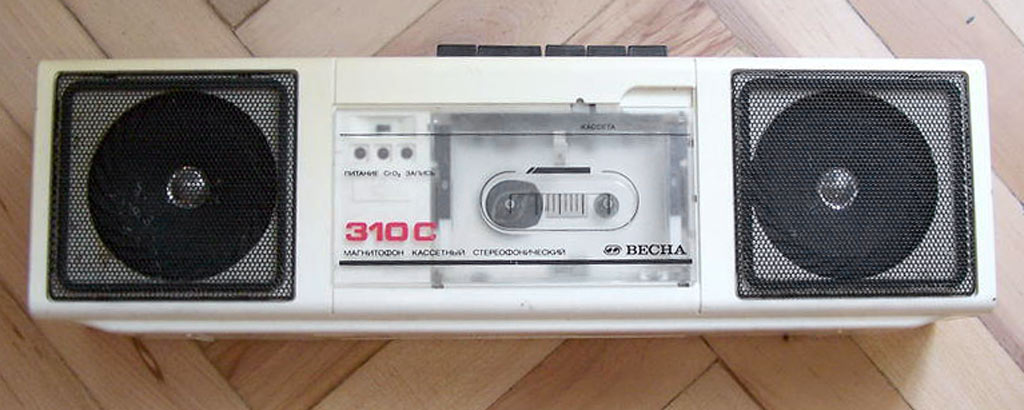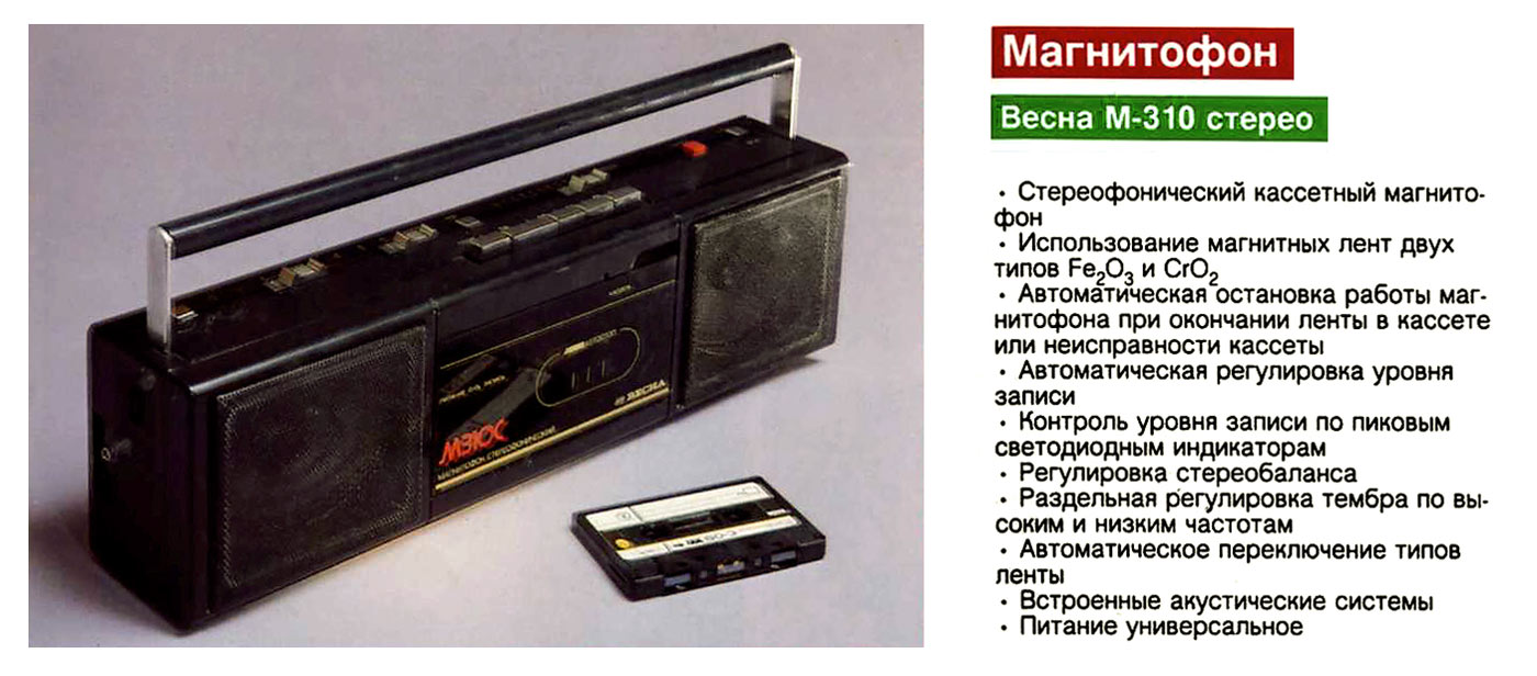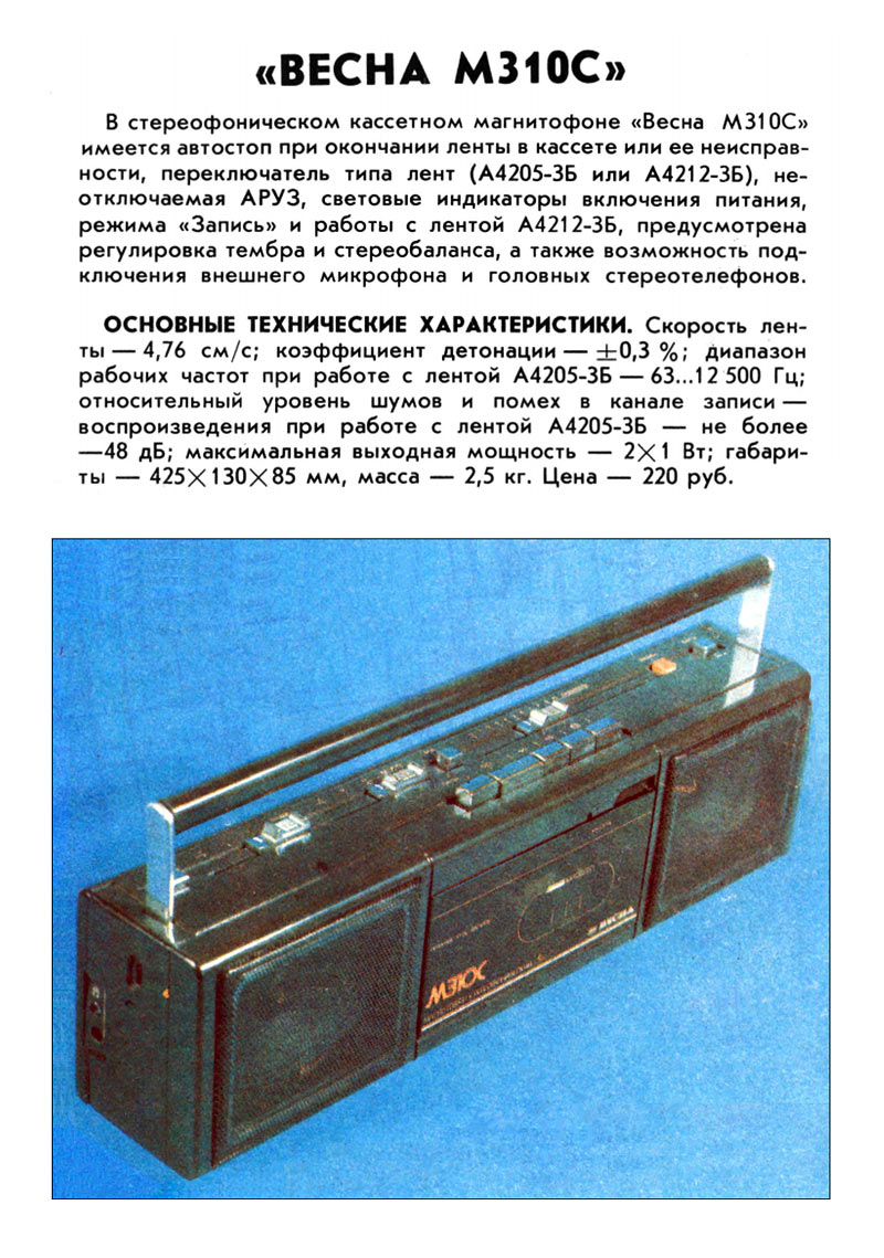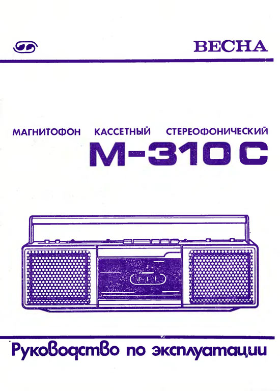Кассетный стереофонический магнитофон *Весна-310С* с 1985 года выпускал Запорожский ЭМЗ *Искра*. Магнитофон обеспечивают запись стерео и моно фонограмм с последующим воспроизведением. Есть возможность: автоматического останова по окончании кассеты или её неисправности; автоматической регулировки уровня записи; контроля уровня записи по пиковым индикаторам (на светодиодах); регулировки стереобаланса; раздельной регулировки тембра; использования магнитных лент двух типов; автоматического переключения типов ленты. Система шумопонижения обеспечивает уменьшение помех при воспроизведении. Питание осуществляется от шести элементов 343 или от сети переменного тока, через выносной БП. Корпус магнитофонов изготовлен из ударопрочного полистирола. Цена магнитофона 265 рублей. Тип ленты А4205-3 или А4212-ЗБ. Скорость магнитной ленты 4,76 см/с. Диапазон частот при использовании ленты А4205-3 - 63...10000 Гц, А4212-ЗБ - 63...12500 Гц. Коэффициент детонации ±0,3%. Коэффициент гармоник на ЛВ - 4,5%. Относительный уровень шумов и помех в канале З-В на ленте А4205-3 без СШ -48 дБ, с СШ -56 дБ. Номинальная выходная мощность 2х0,5 Вт, максимальная 2х1,2 Вт. Габариты модели 425х130х85 мм. Масса 2,2 кг. С 1987 года магнитофон именовался *Весна М-310С*.