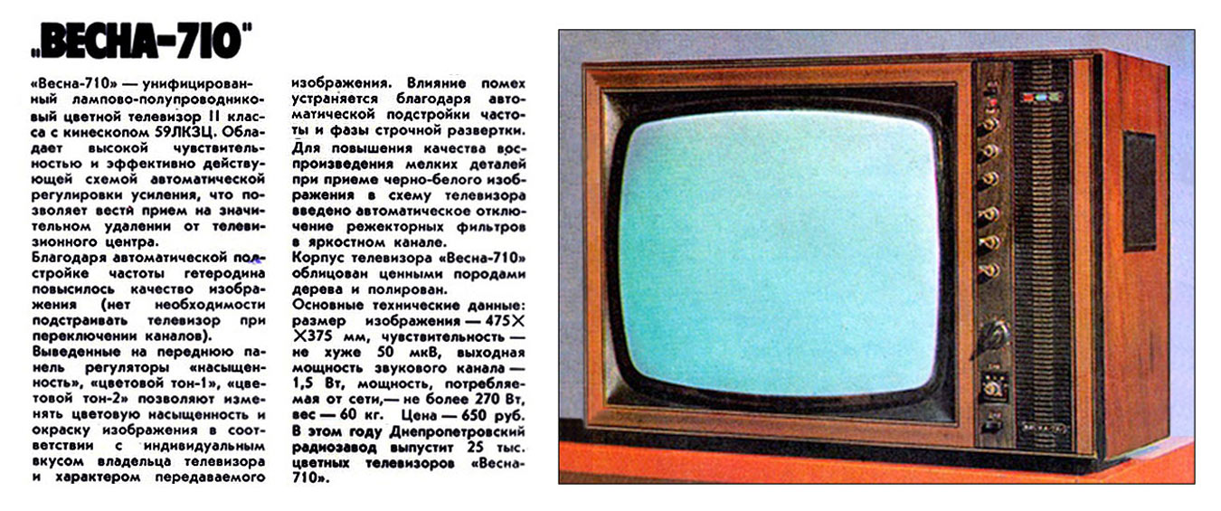 Цветной телевизор *Весна-710* с 1975 года выпускал Днепропетровский радиозавод. Схема и конструкция телевизора **Весна-710** существенно не отличается от базовой модели унифицированного цветного телевизора 2-го класса УЛПЦТ-59-II-1. В модели использовано 2 громкоговорителя типа 3ГД-38Е и 2ГД-36. Чувствительность телевизора - 50 мкВ. Разрешающая способность чёрно-белого изображения 450 линий. Номинальная выходная мощность - 1,5 Вт. Диапазон воспроизводимых частот - 80...12500 Гц. Габариты телевизора 580x445x796 мм. Его масса 58 кг.