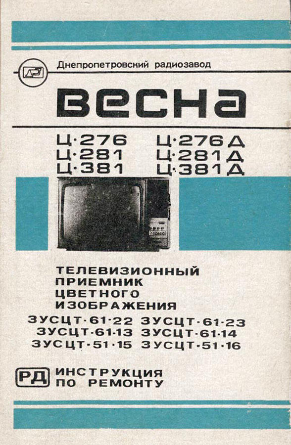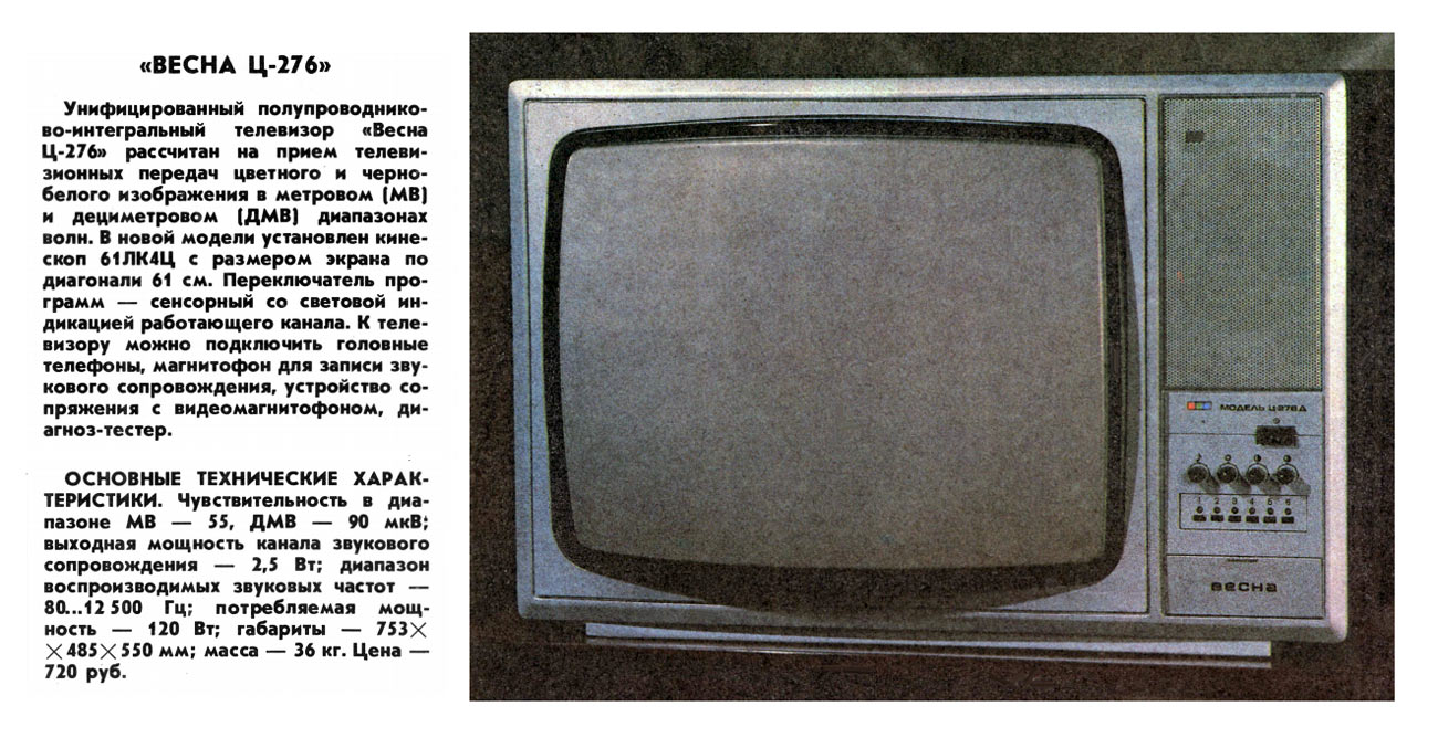 Телевизионный приёмник цветного изображения *Весна Ц-276/Д* С I-кв 1986 года выпускал Днепропетровский радиозавод. Унифицированный цветной телевизионный приёмник второго класса марки **Весна Ц-276Д** (3УСЦТ-61-23/22) собран полностью на полупроводниково-интегральных элементах и рассчитан на приём программ цветного или чёрно-белого изображения в MB и ДМВ (индекс *Д*) диапазонах волн. В телевизоре установлен кинескоп типа *61ЛК4Ц* с размером диагонали экрана 61 см. Выбор программ сенсорный, со световой индикацией работающей программы. Телевизор снабжён разъёмом для включения головных телефонов и магнитофона на запись звукового сопровождения, устройством сопряжения с видеомагнитофоном по низкой частоте. В телевизоре имеется сервисный разъём для подключения диагностического тестера. Чувствительность по каналу изображения: MB 55, ДМВ 90 мкВ. Максимальная мощность канала звука 2,5 Вт. Диапазон частот звука 80...12000 Гц. Потребляемая мощность 120 Вт. Размеры телевизора 753 х 485 х 550 мм. Масса 36 кг. Цена телевизора 720, с индексом *Д* - 755 рублей.