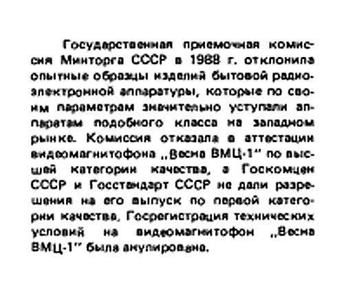 Кассетный видеомагнитофон *Весна-видео ВМЦ-1* опытно выпущен в 1988 году Запорожским электромашиностроительным заводом *Искра*. ВМ создан на основе ЛПМ от видеомагнитофона *Электроника ВМ-12* и является частичной копией видеомагнитофонов *National NV-100* и *Panasonic NV-8420*. Видеомагнитофон *Весна-видео ВМЦ-1* имеет облегчённую, удобную для переноски конструкцию и не имеет телевизионного тюнера. В Киргизии, на Фрунзенском заводе *ЭВМ* в 1988 году так же был опытный выпуск видеомагнитофона, но под наименованием *Иссык-Куль ВМЦ-1*. В том же 1988 году Государственная приёмочная комиссия Минторга СССР из-за несоответствия стандартам на подобный класс запретила серийный выпуск этих моделей.