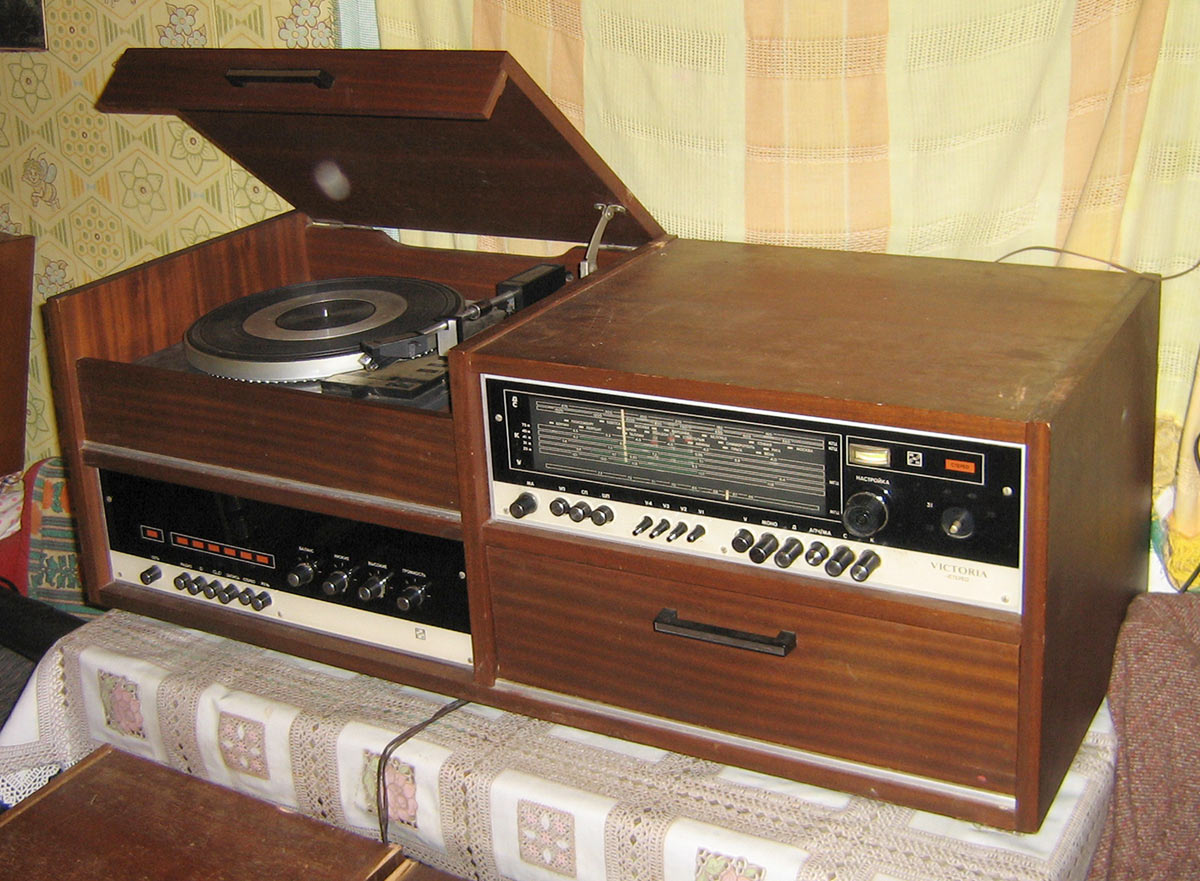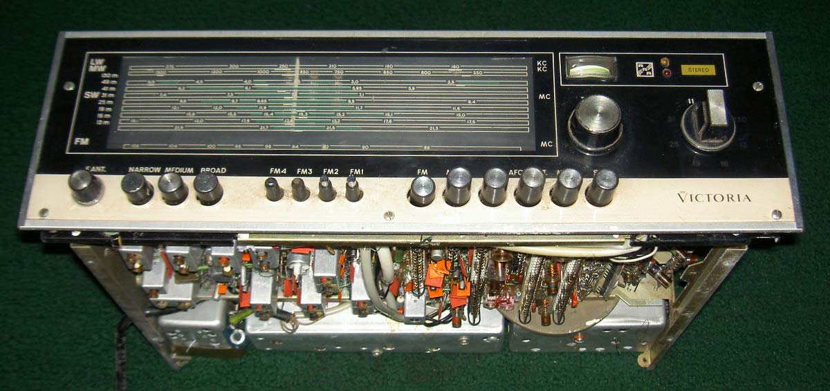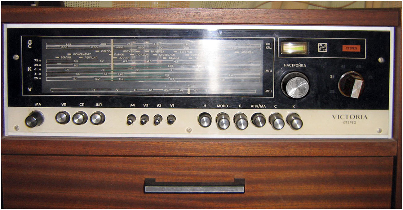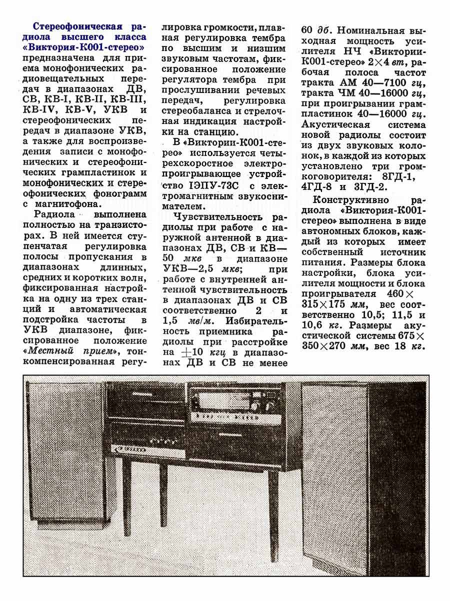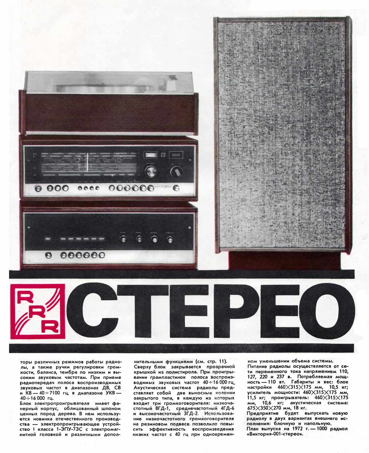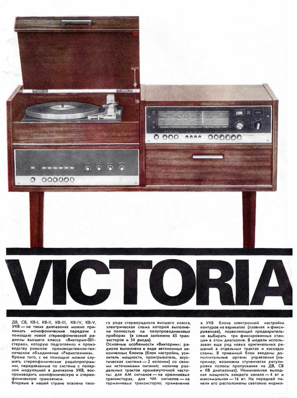 Стационарная транзисторная радиола *Виктория-001-стерео* с осени 1972 года выпускалась на Рижском радиозаводе имени А.С.Попова. Стереофоническая радиола высшего класса **Виктория-001-стерео** - имела консольное или полочное оформление, поэтому перед цифрами 001 стоял индекс К или Н. На фото слева консольный вариант модели. Радиола предназначена для приёма монофонических радиопрограмм в диапазонах ДВ, СВ, пяти поддиапазонах KB и УКВ, стереофонических передач в диапазоне УКВ-ЧМ, а также для прослушивания записи с моно и стереофонических грампластинок. В радиоле имеется ступенчатая регулировка полосы пропускания в диапазонах ДВ, СВ и КВ, фиксированная настройка на одну из трёх станций и автоматическая подстройка частоты в УКВ-ЧМ диапазоне, фиксированное положение местный приём, тонкомпенсированная регулировка уровня громкости, плавная регулировка тембра для высших и низших звуковых частот, фиксированное положение тембров при прослушивании речевых передач, регулировка стереобаланса и стрелочная индикация настройки на станцию. В радиоле используется четырёхскоростное ЭПУ I-ЭПУ-73С с электромагнитным звукоснимателем. Чувствительность с наружной антенной в диапазонах ДВ, СВ, KB - 50 мкВ, в диапазоне УКВ-ЧМ - 2,5 мкВ. С магнитной антенной в диапазонах ДВ 2 мВ/м и СВ 1,5 мВ/м. Избирательность в диапазонах ДВ и СВ - 60 дБ. Номинальная выходная мощность усилителя НЧ 2х4 Вт, максимальная 2х16 Вт. Полоса звуковых частот тракта AM 40...6300 Гц, тракта ЧМ и грамзаписи 40...16000 Гц. В каждой из акустических систем радиолы установлено по три громкоговорителя типов: 8ГД-1, 4ГД-8 и ЗГД-2. Радиола выполнена в виде автономных блоков, каждый из которых имеет собственный источник питания. Размеры блока настройки, усилителя мощности и проигрывателя одинаковы 457х315х175 мм, вес соответственно - 10.5, 11.5 и 10.6 кг. Консольная радиола имеет размеры - 974х672х350 мм. Размеры одной акустической системы - 672х350х270 мм, вес - 18 кг.