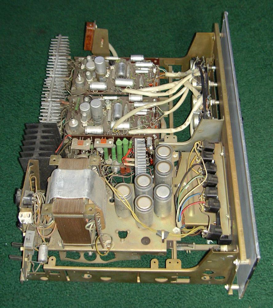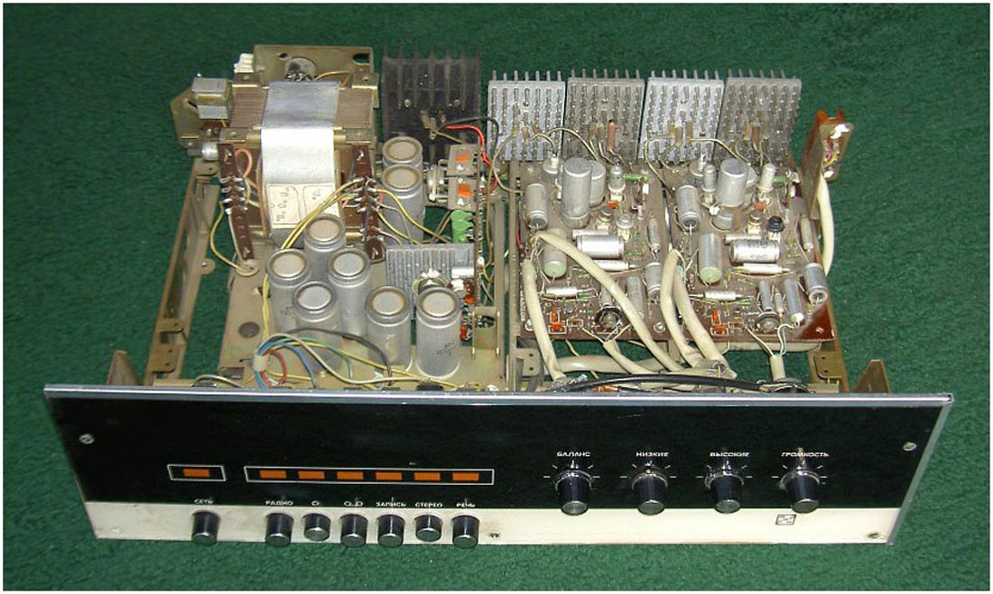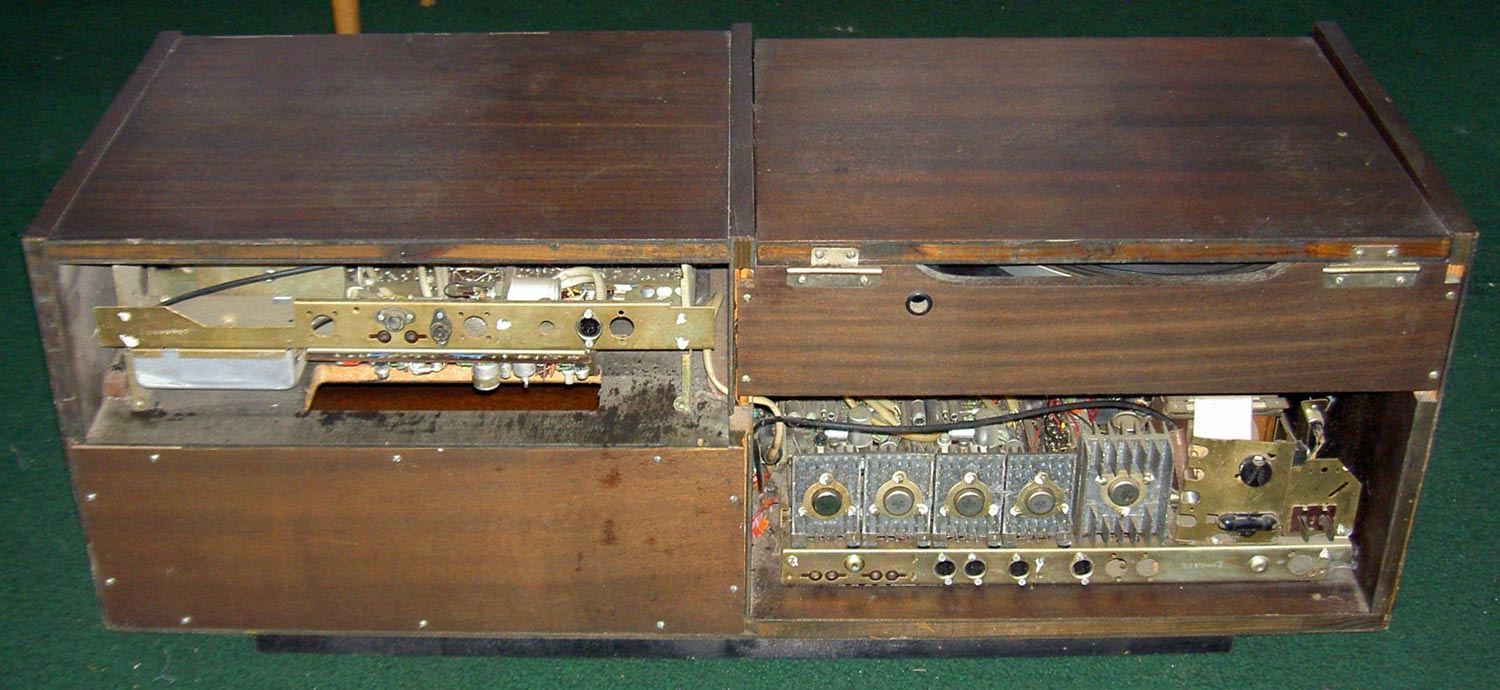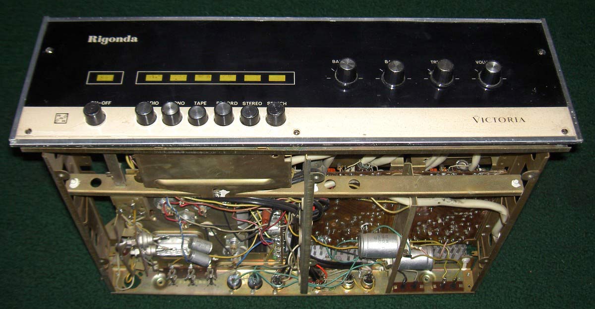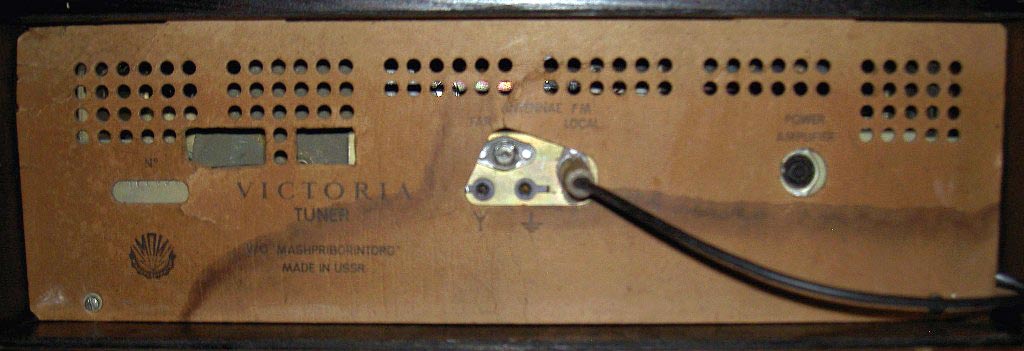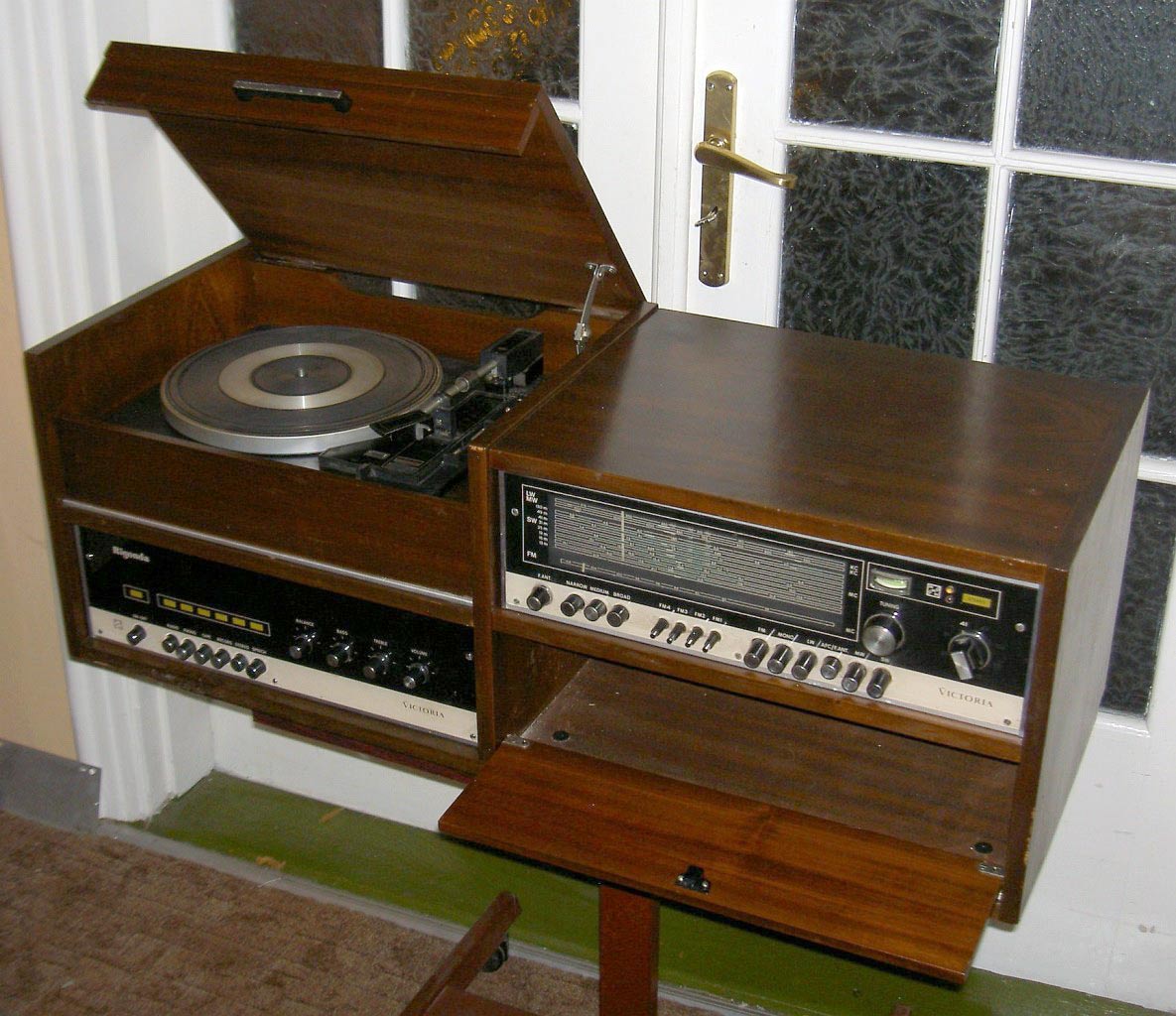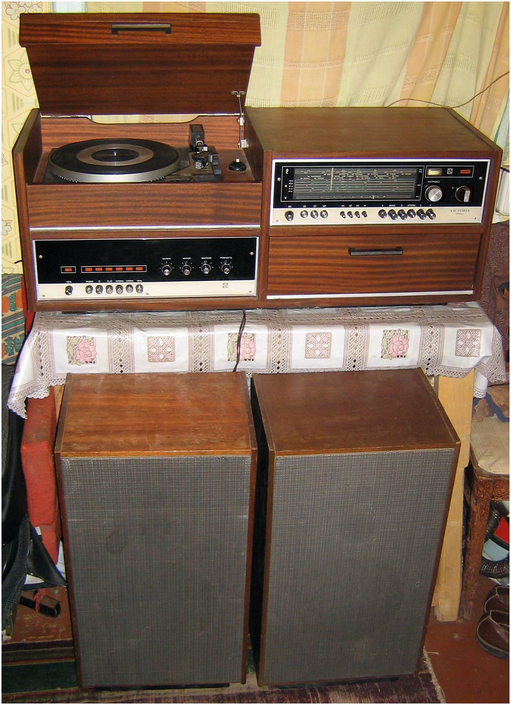 Стационарная транзисторная радиола *Виктория-001-стерео* с осени 1972 года выпускалась на Рижском радиозаводе имени А.С.Попова. Стереофоническая радиола высшего класса **Виктория-001-стерео** - имела консольное или полочное оформление, поэтому перед цифрами 001 стоял индекс К или Н. На фото слева консольный вариант модели. Радиола предназначена для приёма монофонических радиопрограмм в диапазонах ДВ, СВ, пяти поддиапазонах KB и УКВ, стереофонических передач в диапазоне УКВ-ЧМ, а также для прослушивания записи с моно и стереофонических грампластинок. В радиоле имеется ступенчатая регулировка полосы пропускания в диапазонах ДВ, СВ и КВ, фиксированная настройка на одну из трёх станций и автоматическая подстройка частоты в УКВ-ЧМ диапазоне, фиксированное положение местный приём, тонкомпенсированная регулировка уровня громкости, плавная регулировка тембра для высших и низших звуковых частот, фиксированное положение тембров при прослушивании речевых передач, регулировка стереобаланса и стрелочная индикация настройки на станцию. В радиоле используется четырёхскоростное ЭПУ I-ЭПУ-73С с электромагнитным звукоснимателем. Чувствительность с наружной антенной в диапазонах ДВ, СВ, KB - 50 мкВ, в диапазоне УКВ-ЧМ - 2,5 мкВ. С магнитной антенной в диапазонах ДВ 2 мВ/м и СВ 1,5 мВ/м. Избирательность в диапазонах ДВ и СВ - 60 дБ. Номинальная выходная мощность усилителя НЧ 2х4 Вт, максимальная 2х16 Вт. Полоса звуковых частот тракта AM 40...6300 Гц, тракта ЧМ и грамзаписи 40...16000 Гц. В каждой из акустических систем радиолы установлено по три громкоговорителя типов: 8ГД-1, 4ГД-8 и ЗГД-2. Радиола выполнена в виде автономных блоков, каждый из которых имеет собственный источник питания. Размеры блока настройки, усилителя мощности и проигрывателя одинаковы 457х315х175 мм, вес соответственно - 10.5, 11.5 и 10.6 кг. Консольная радиола имеет размеры - 974х672х350 мм. Размеры одной акустической системы - 672х350х270 мм, вес - 18 кг.