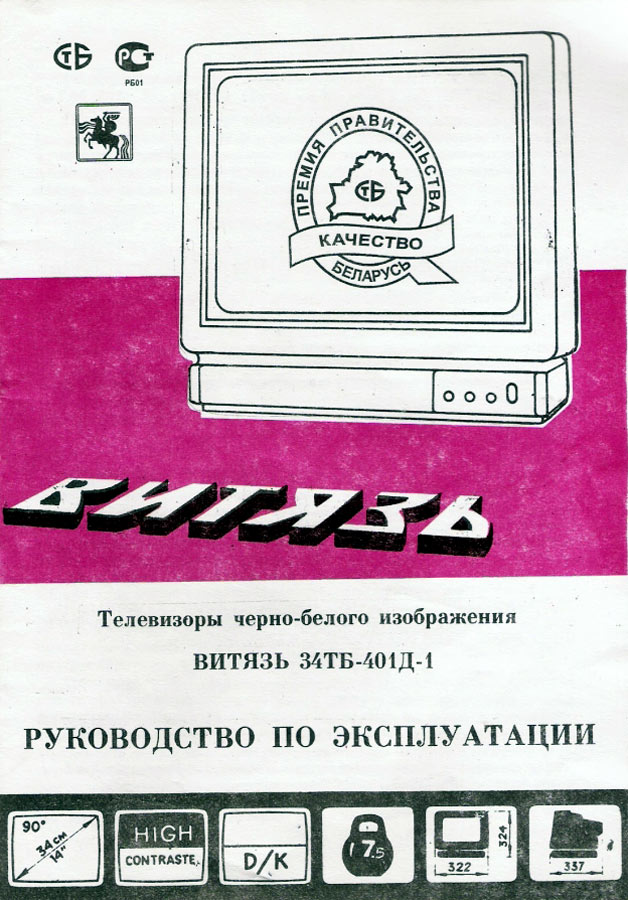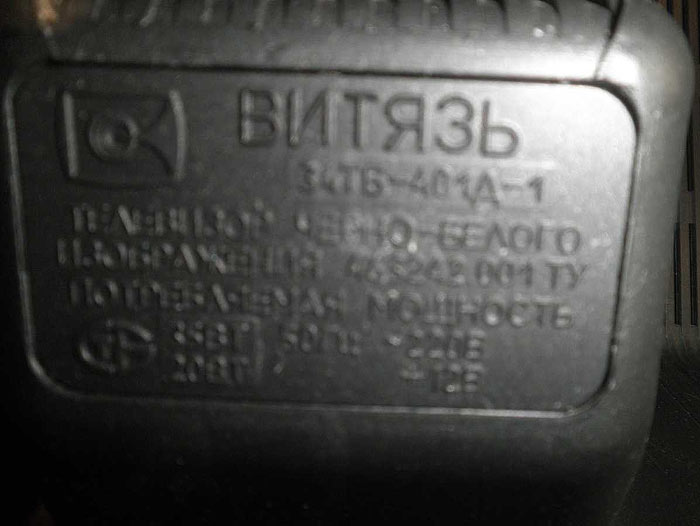 Телевизор чёрно-белого изображения *Витязь 34ТБ-401Д* выпускался с 1997 года Витебским заводом цветных телевизоров. Малогабаритный полупроводниково-интегральный телевизор чёрно-белого изображения *Витязь 34ТБ-401Д* предназначен для приёма программ телевидения в диапазонах МВ и ДМВ. Диагональ экрана 34 см. Возможность настройки на 90 каналов. Вывод на экран состояния регулировок. Автоматический поиск и настройка каналов в МВ/ДМВ диапазонах, включая кабельный диапазон. Стандарты D/K и B/G. Бесшумный поиск каналов. Номинальная выходная мощность канала звука 1,5 Вт. Возможность питания от автономного источника 12 В. Питание от электросети, напряжением 198...242 В. Потребляемая мощность 30 Вт, при питании от автономного источника 20 Вт. Габариты телевизора - 400 х 380 х 360 мм. Масса 8,1 кг. С 1998 года завод выпускал аналогичный телевизор с наименованием *Витязь 34ТБ-401Д-1*.