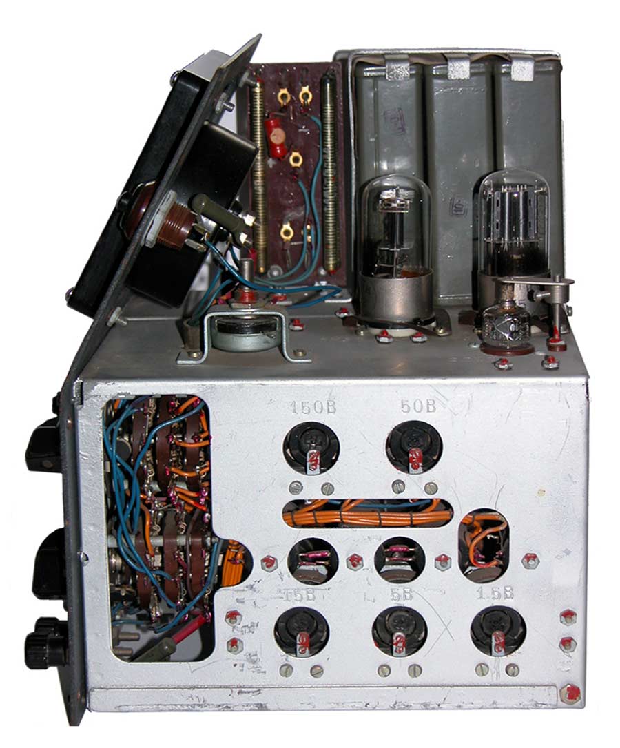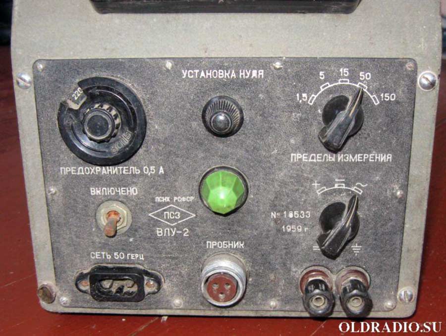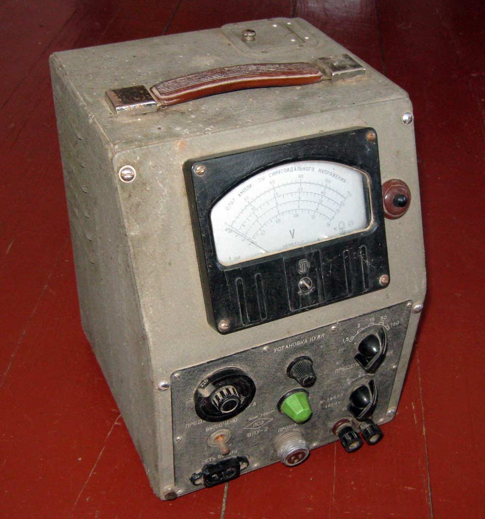 Вольтметр ламповый универсальный *ВЛУ-2* выпускался с начала 1957 года. Переносной многопредельный прибор *ВЛУ-2* (с делителями ДНС-8, ДНЕ-7 и ДНЕ-6) предназначен для измерения постоянного и переменного напряжения в диапазоне частот от 20 Гц до 400 МГц и рассчитан для применения в условиях лабораторий, заводских цехов и мастерских. Комплектуется щупом и ёмкостными делителями. Основные технические характеристики: Пределы измеряемых напряжений от 0,1 до 150 В. Пределы измерения 0-1-5-5-15-50-150 В. Активное входное сопротивление на частоте до 50 Гц - 10 МОм, на частоте выше 100 МГц - 50 кОм. Основная погрешность прибора 2,5%. Питание прибора - сеть переменного тока 110, 127 или 220 в (50 Гц). Потребляемая можность 65 Вт. Пределы измерения прибора могут быть расширены при применении делителей, придаваемых к вольтметру: ДНС-8 до 5000 В, ДНЕ-7 до 5000 В (с 20 Гц до 5 кГц), ДНЕ-6 до 5000 В (с 5 кГц до 30 МГц).