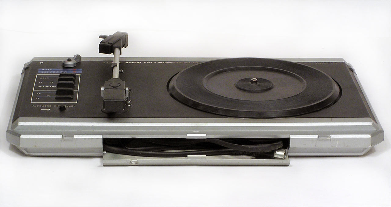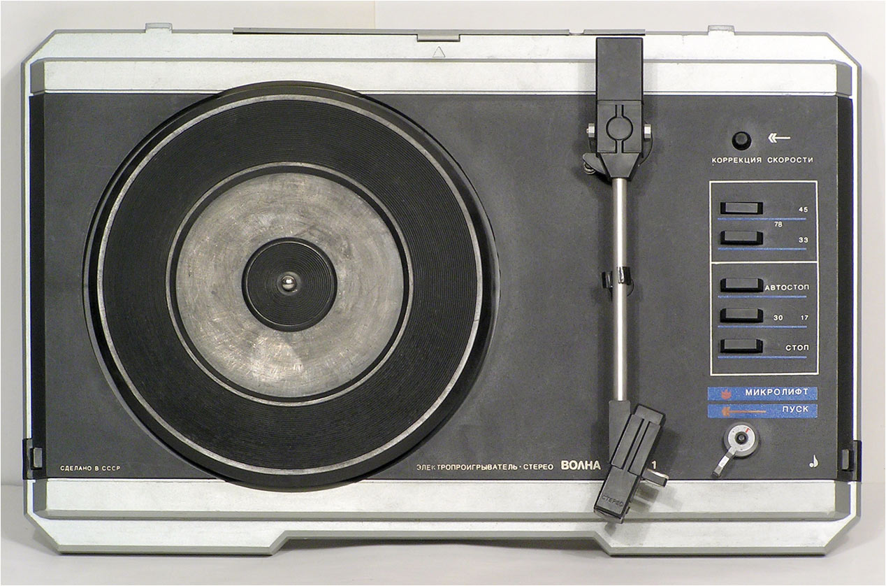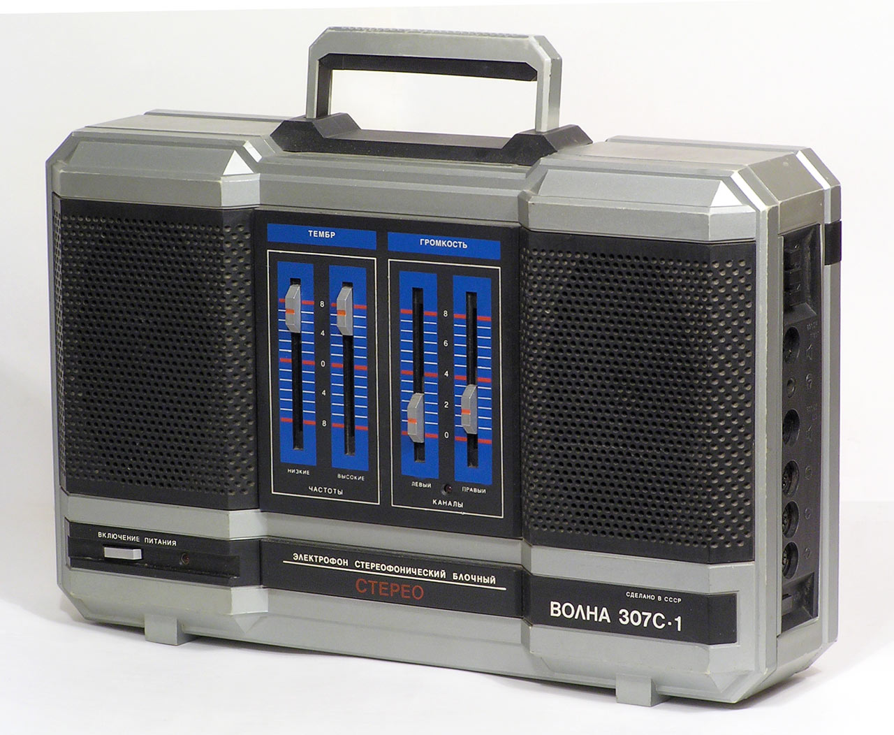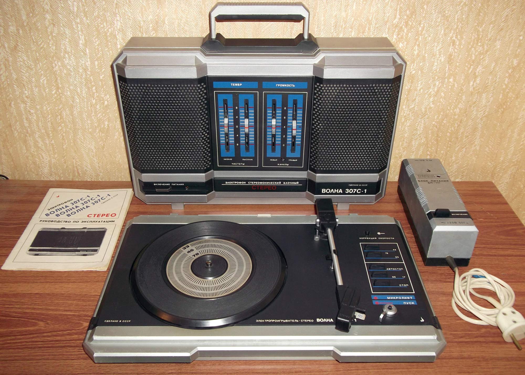 Электрофон транзисторный *Волна ЭФ-307-С-1* с I-кв 1991 года выпускало Саратовское ПО *Корпус*. Электрофон с универсальным питанием *Волна ЭФ-307С-1* предназначен для прослушивания механической записи со стерео и монофонических грампластинок всех форматов. Привод диска прямой, от специального тихоходного электродвигателя. В электрофоне имеется регулировка тембра НЧ и ВЧ, возможность расширения стереобазы. Питание универсальное, от сети или от 6-ти элементов 343. Частота вращения диска 33 об/мин. Коэффициент детонации 0,2%. Номинальная выходная мощность УЗЧ - 2х1,5 Вт. Диапазон частот, воспроизводимых АС - 100...10000 Гц. Потребляемая от сети мощность 8 Вт, от батарей 3,5 Вт. Габариты электрофона 480х260х118 мм. Его масса 6,5 кг. Цена 120 рублей.