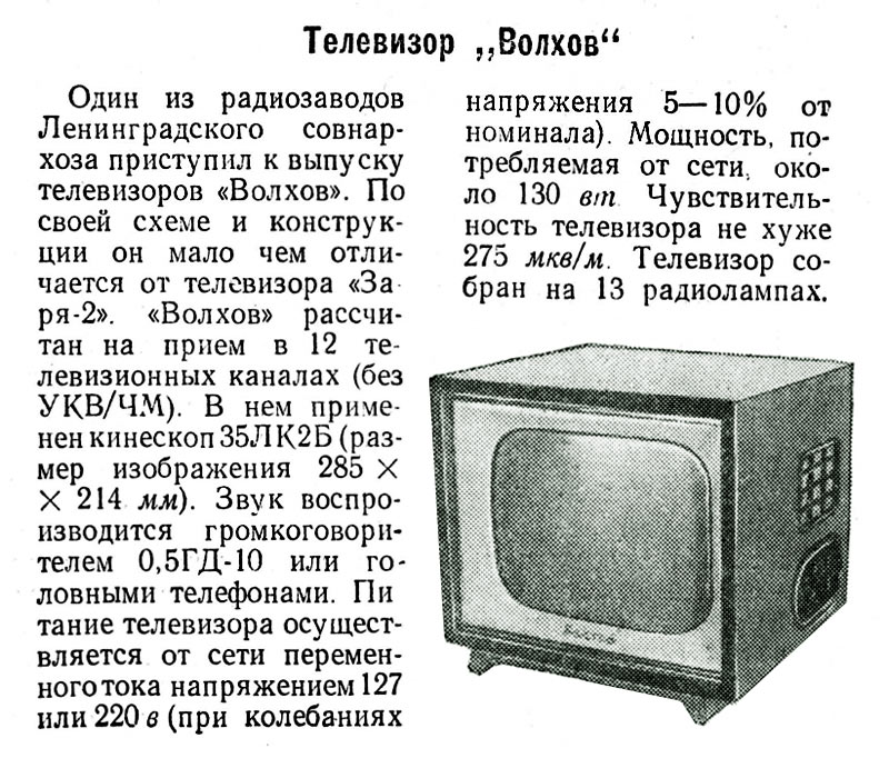 Телевизионный приёмник чёрно-белого изображения *Волхов* с 1960 года выпускал Новгородский телевизионный завод. Телевизор **Волхов** рассчитан на работу в двенадцати каналах. Он имеет 13 ламп, 8 диодов и кинескоп 35ЛК2Б с размером экрана 285х215 мм. Чувствительность телевизора в 275 мкВ делает возможным приём телевизионных студий с наружной антенной на расстоянии до 50 км. По схеме параметрам и конструкции телевизор сходен с моделями **Заря-2а** и **Спутник**. В телевизоре впервые учтён ряд требований нормали на телевизоры 3 класса, а именно: приём в 12 каналах, АРУ и прослушивание звукового сопровождения на наушники при выключенном динамике, гнёзда наушников можно использовать и для записи звука на магнитофон. Громкоговоритель 0,5ГД-10 расположен справа футляра и обеспечивает достаточную громкость в небольшом помещении. Телевизор собран в деревянном полированном футляре с имитацией под красное дерево. Размеры телевизора 380х350х420 мм, масса 18 кг. Задняя стенка выполнена из металла, в виде усечённой пирамиды. На ней имеются отверстия для улучшения теплового режима. Конструкция шасси и его вертикальное расположение и съемный задний кожух обеспечивают доступ к лампам и другим деталям. Основные ручки управления выведены на правую боковую стенку футляра, а вспомогательные на заднюю. Экран кинескопа защищён стеклом. Питается ТВ от сети 127 или 220 В. Потребляемая мощность 130 Вт. Цена телевизора 168 рублей после реформы 1961 года. Радио №4/1965, ст. 30