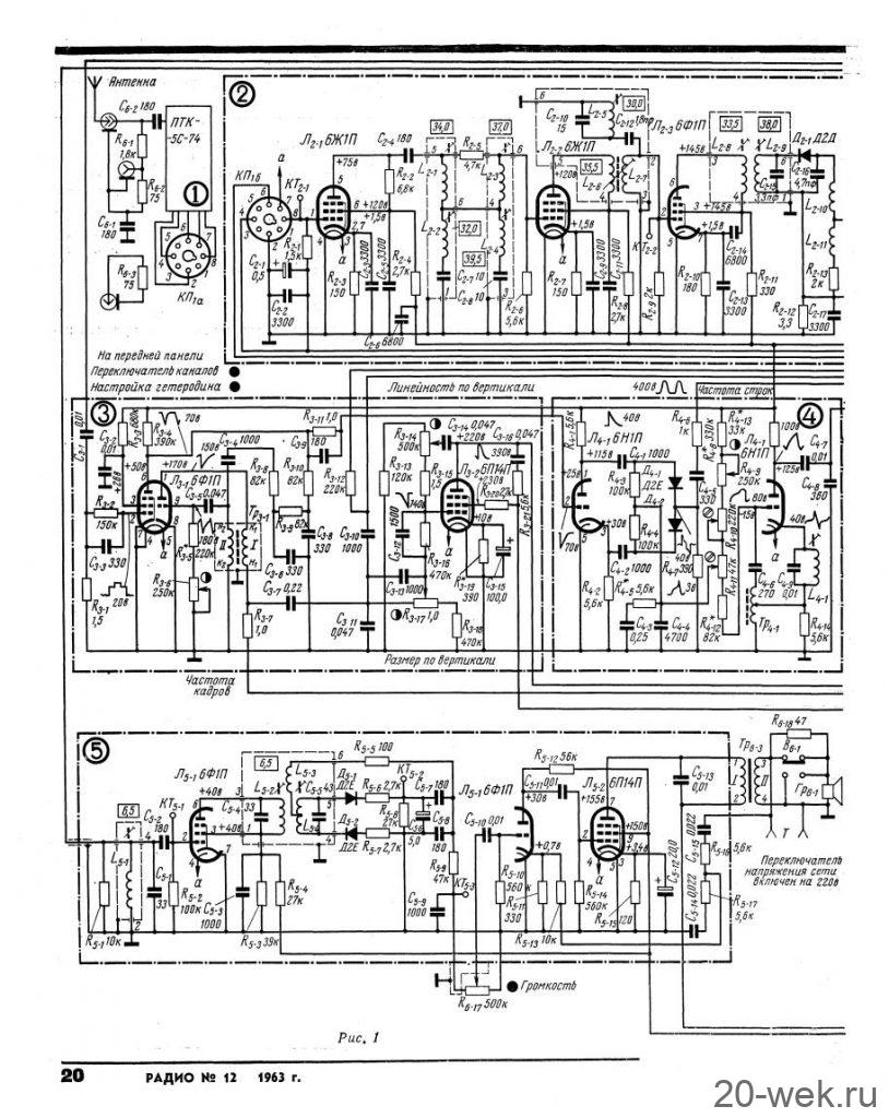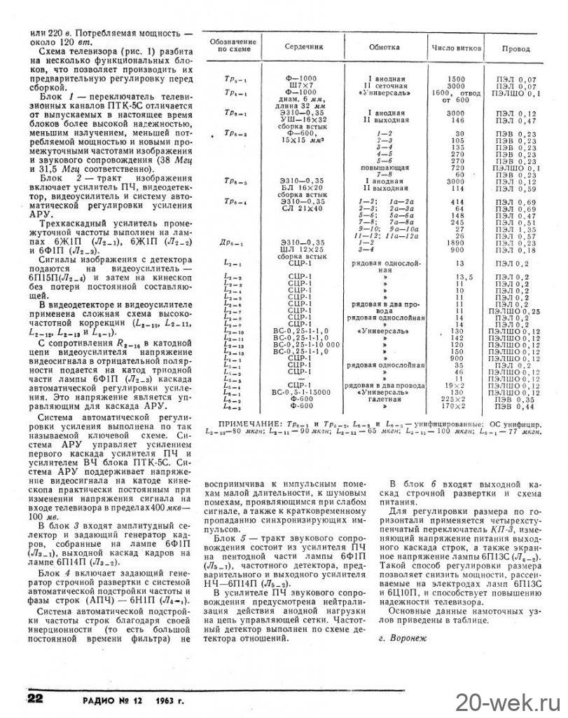 Телевизор 3-го класса *Воронеж-6* (УНТ-35) подготовил к выпуску с осени 1963 года Воронежский завод *Электросигнал*. Телевизор должен был прийти на смену моделям серии **Воронеж**. Он был выполнен по унифицированной схеме и конструкции, по которой с 1964 года производились телевизоры: **Рекорд-64**, **Рассвет**, **Аэлита**, **Снежок**, **Весна-3** и некоторые другие. Телевизор **Воронеж-6** был первым в линейке новых моделей. Он выполнен на кинескопе 35ЛК2Б и рассчитан для работы в любом из 12-ти каналов. Четкость изображения в центре экрана по горизонтали 400 линий, по вертикали 500 линий. Число различимых градаций яркости по испытательной таблице - 0249 не менее 8. Чувствительность телевизора на всех каналах 200 мкВ. Полоса воспроизводимых звуковых частот 150...5000 Гц. Телевизор питается от сети переменного тока с напряжением 127 или 220 В. Потребляемая мощность - 120 Вт. Электрическая схема телевизора разбита на несколько функциональных блоков, что позволяет производить их предварительную регулировку перед сборкой. Переключатель телевизионных каналов ПТК-5С отличается надежностью, малой потребляемой мощностью и новыми ПЧ. Радио №12/1963 ст.20