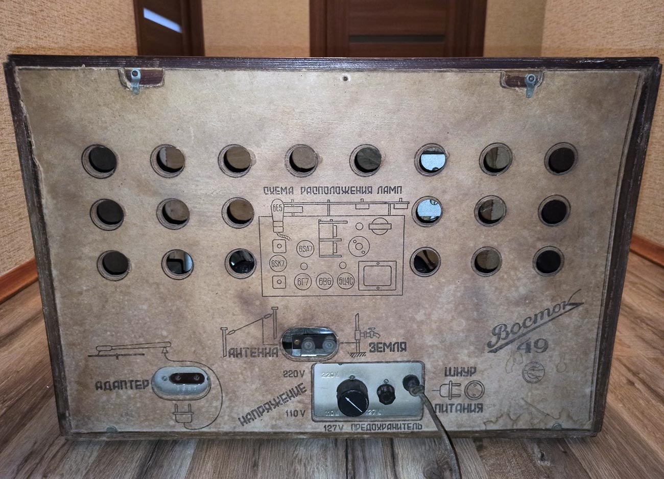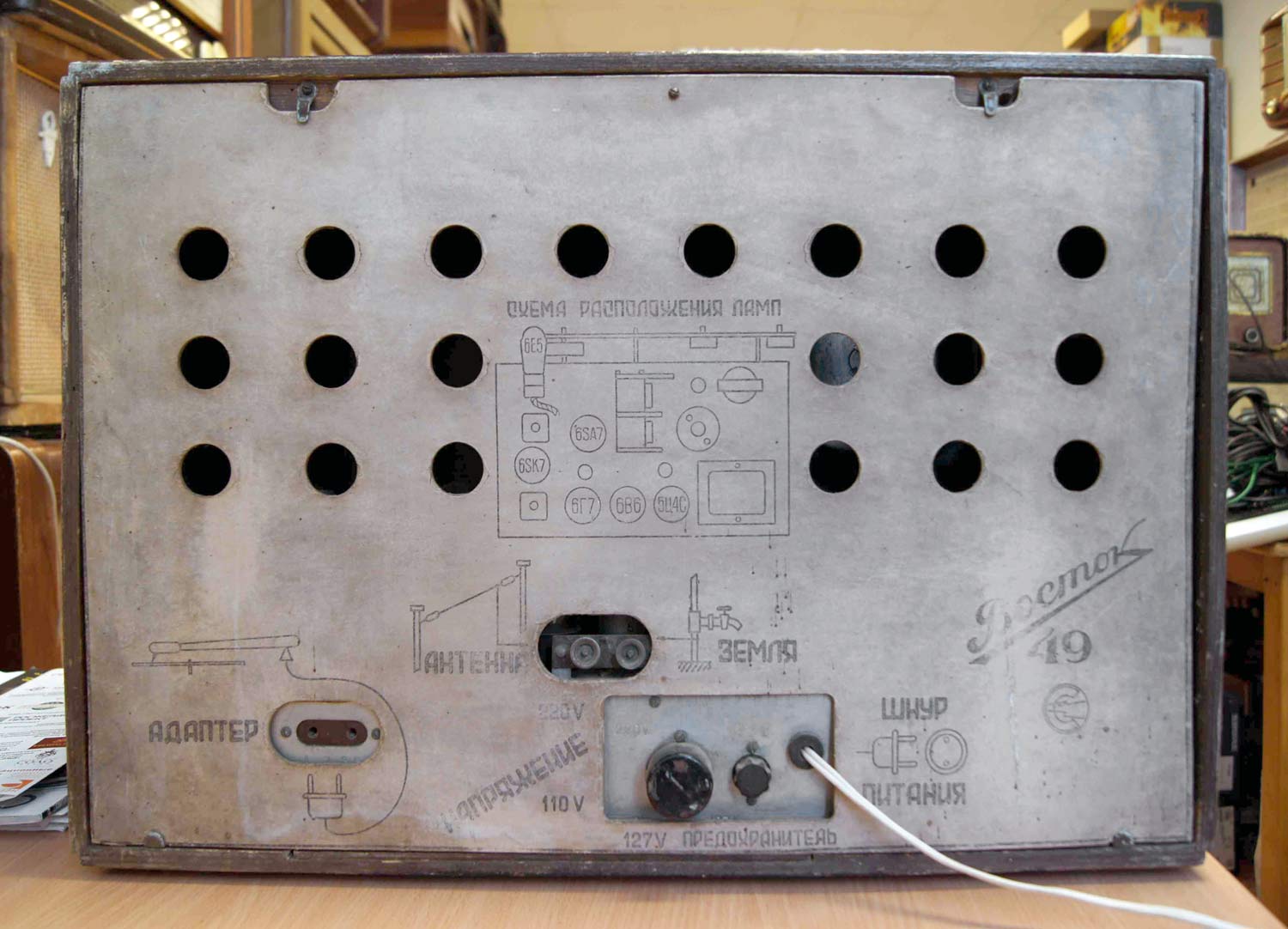 Радиоприёмник сетевой ламповый *Восток-49* с 1949 года выпускал Новосибирский завод *Электросигнал*. **Восток-49** собран на 6-ти лампах по супергетеродинной схеме. Особенностью РП является шкала, выполненная в виде четырёх полосок из органического стекла. Каждая полоска имеет градуировку, соответствующая диапазону. При включении РП, лампочки подсвечивают полоску одного диапазона. Диапазоны ДВ 150...410 кГц, СВ 520...1500 кГц, КВ-1 4...9,8 мГц, КВ-2 11,5...16,1 мГц. Чувствительность в диапазонах ДВ, СВ 200 мкВ, КВ 300 мкВ. Избирательность на ДВ, СВ 26 дБ, КВ 20 дБ. Диапазон воспроизводимых частот 100...4000 Гц, с гнёзд звукоснимателя 80...6000 Гц. Номинальная выходная мощность УНЧ 1,5 Вт. Потребляемая от сети мощность 80 Вт. Закончен выпуск радиоприёмника в 1954 году.