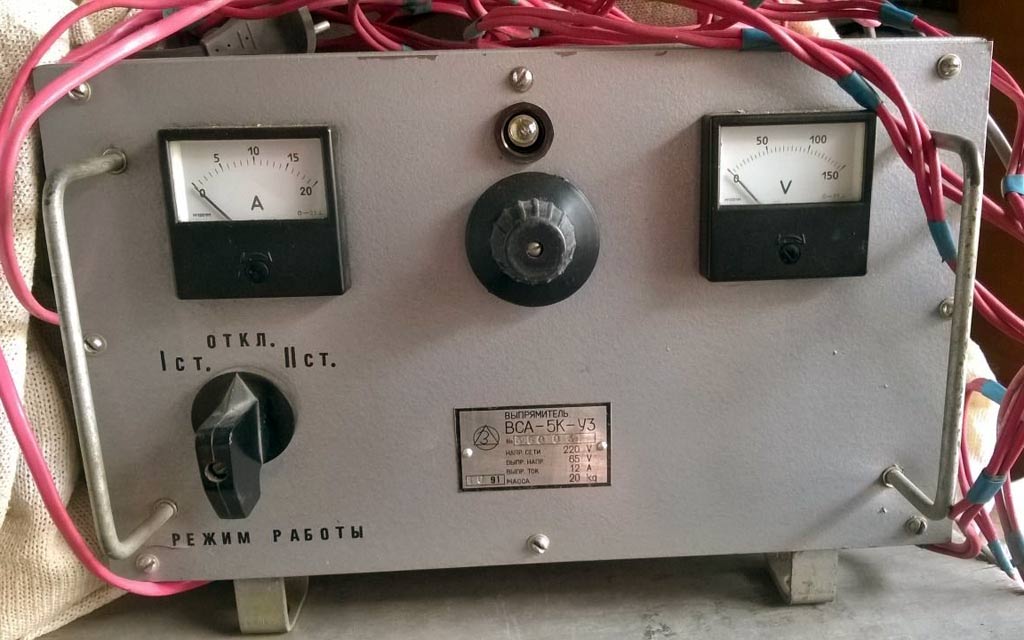 Выпрямитель селеновый *ВСА-5К* выпускался предположительно с 1963 года. Производился до начала 90-х. Несколько раз модернизировался. Предназначен для зарядки аккумуляторных батарей постоянным стабилизированным током. Напряжение на выходе регулируется от 0 до 65 вольт, ток от 0 до 12 ампер. Выпрямители также могут быть использованы в качестве источников постоянного стабилированного тока, для питания радиотехнических приборов и аппаратуры. Модификации выпрямителей имели разное выходное напряжение и ток. Масса выпрямителя от 15,5 до 24 кг. Габариты 355х275х275 мм.