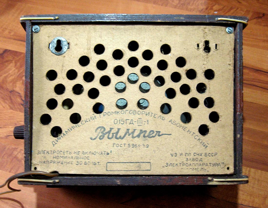 Абонентский громкоговоритель "Вымпел" с 1959 года выпускал Гомельский завод "Электроаппаратура". Абонентский громкоговоритель "Вымпел" тип "0,15ГД-III-1" выполнен в деревянном корпусе и предназначен для работы местного трансляционного радиовещания, с напряжением 30 вольт.
