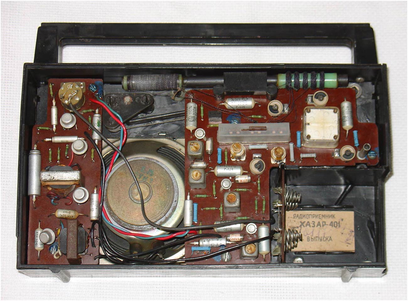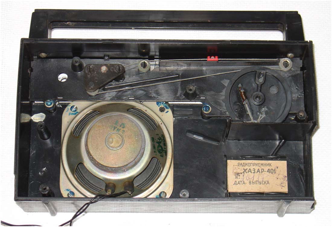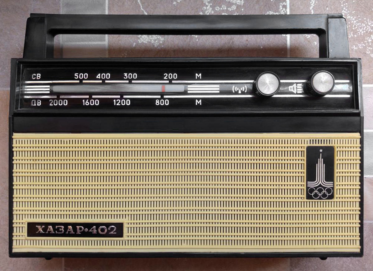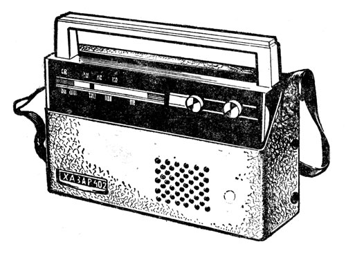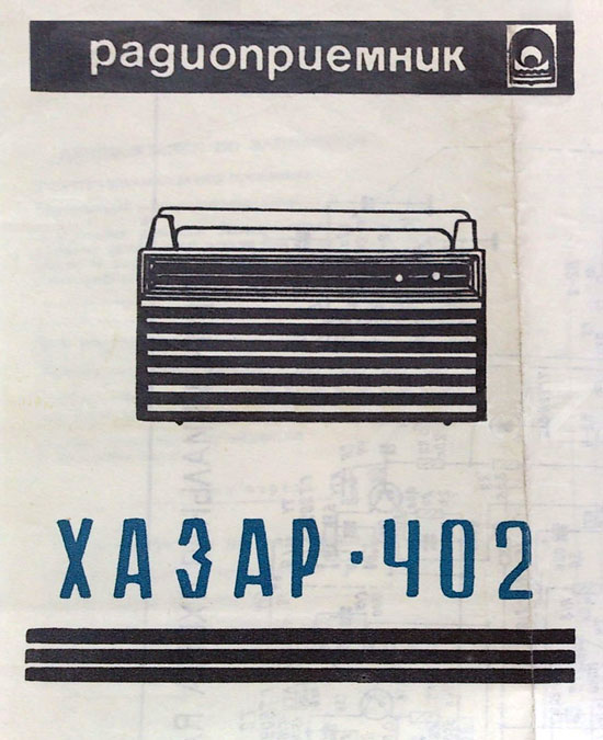 Портативный радиоприёмник *Хазар-402* с 1975 года выпускал Бакинский радиозавод. **Хазар-402** (в переводе с азербайджанского языка - Каспий. Каспийское море) - радиоприёмник 4-го класса супергетеродинного типа, предназначенный для приёма радиовещательных станций в диапазонах СВ и ДВ. Чувствительность 0,8 мВ в СВ и 1,5 мВ/м в ДВ диапазоне. Селективность по соседнему каналу 20 дБ. Номинальная выходная мощность 150 мВт, максимальная 250 мВт. Диапазон воспроизводимых звуковых частот 315...3550 Гц. Питание от двух батарей 3336Л. По электрической схеме, конструкции и параметрам приёмник схож с моделью **Хазар-401**, использован лишь его немного изменённый футляр. Цена радиоприёмника 29 рублей. Радиоприёмник с Олимпийской символикой стоил 31 рубль. Радиоприёмник планировали выпускать в чехле из кожзаменителя, но не выпускали. В некоторых партиях радиоприёмников *Хазар-402* экспериментально применяли усилители НЧ на микросхеме К174УН4Б (10-е фото).