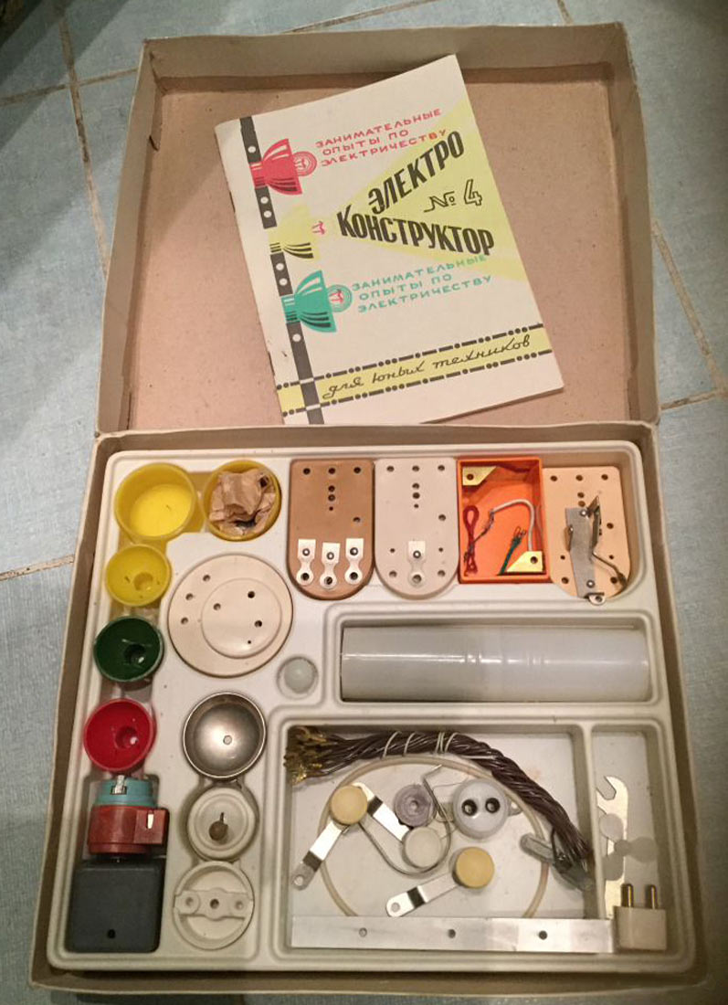 Занимательные опыты по электричеству *Электроконструктор № 4* выпускался предположительно с 1987 года Московским ПО *Геофизприбор*. Описание нет.