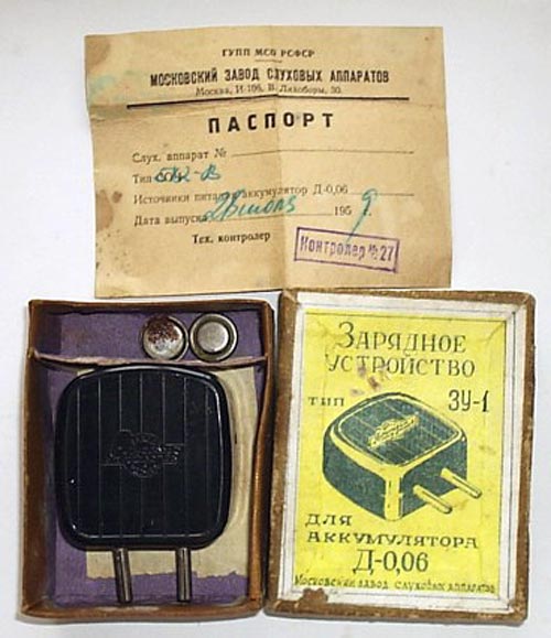 Зарядное устройство *ЗУ-1* с 1961 года выпускал Московский завод слуховых аппаратов. ЗУ предназначено для зарядки аккумуляторов диаметром 20 мм.