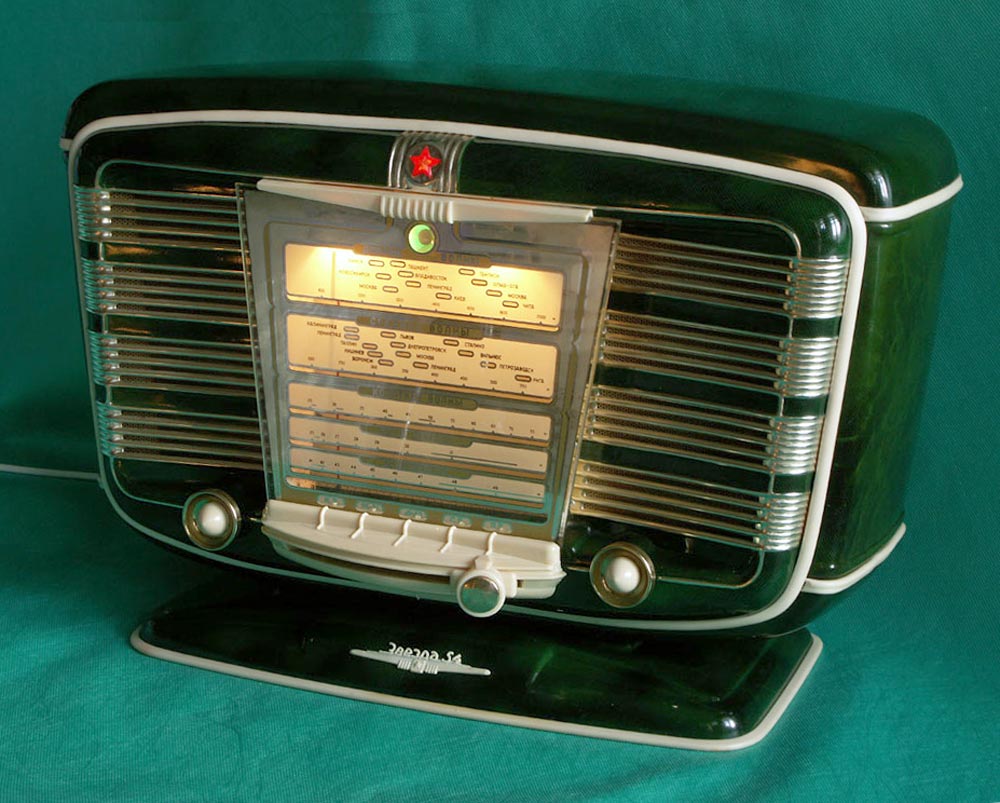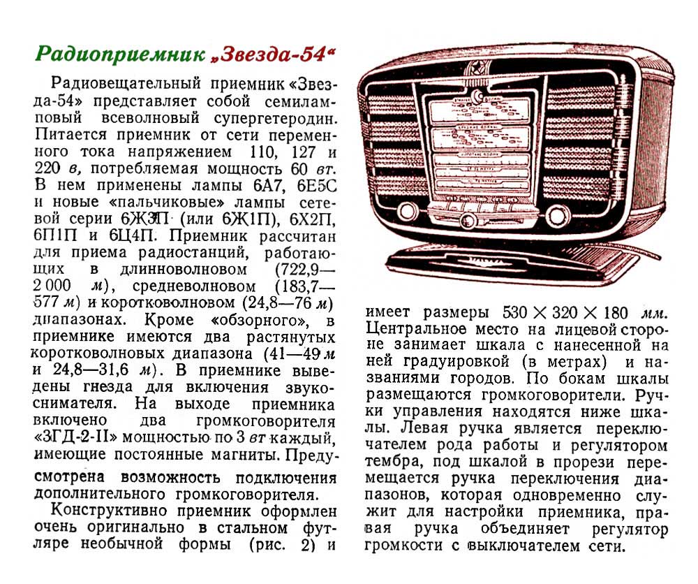 Радиоприёмник сетевой ламповый *Звезда-54* со II-кв 1954 года выпускали Харьковский завод *Коммунар* и Московский завод *Мосприбор*. Выпуск радиоприёмника был достаточно значимым событием середины пятидесятых годов в СССР. Приёмник не вписывался в привычную линейку моделей унылых и серых приёмников и радиол в деревянных футлярах, как близнецы похожих друг на друга и не меняющиеся по оформлению годами. Средства массовой информации в основном в газетных и журнальных изданиях тех лет очень эффектно описывали появление радиоприёмника *Звезда-54* как огромный прорыв в оформительском дизайне, как последний писк моды, что давало людям надежду о наступлении новой, светлой жизни. На самом деле всё было куда проще и прозаичней. Радиоприёмник *Звезда-54* по своему внешнему оформлению полная копия французского радиоприёмника *Excelsior-52* выпуска 1952 года. Точно не установлено каким образом французский приёмник попал в ИРПА. По некоторым данным его, как подарок привезли дипломаты, посещавшие Францию в 1952 году по вопросу независимости Австрии. По другой версии радиоприёмник был специально закуплен для копирования и выпуска по распоряжению высшего руководства. Ещё один штрих, имеющий отношение к выпуску радиоприёмника: B послевоенные годы правительством CCCР было принято решение, предусматривающее выпуск оборонными предприятиями СССР вместе со специальной продукцией также и товаров ширпотреба. B соответствии c этим c 1952 года Всесоюзным научно-исследовательским институтом радиовещательного приёма и акустики имени А.С.Попова, сокращённо *ИРПА*, совместно с заводом **Коммунар** (Харьков, Украина) началась разработка и подготовка конвейера, к серийному выпуску радиоприёмника **Звезда-54**. В 1954 году производство приёмника параллельно было передано и на завод Мосприбор (бывший велозавод). B третьем квартале 1954 года радиоприёмник был модернизирован. Модернизация коснулась шасси модели, которое стало вертикальным, для облегчения технологических процессов и расширения цветовой гаммы футляра (красный и зелёный, других цветов не было). Оба варианта, модернизированный и обычный в футлярах двух цветов выпускали оба завода также параллельно, но приёмников в красном футляре было выпущено намного больше. Bсего, а модель производились с 1954 по 1959 год двумя заводами было выпущено 674.000 приёмников **Звeздa-54**. Часто сбивает с толку логотип ИШ на задней крышке или в инструкции аппарата. ИШ - изделие ширпотреба.
