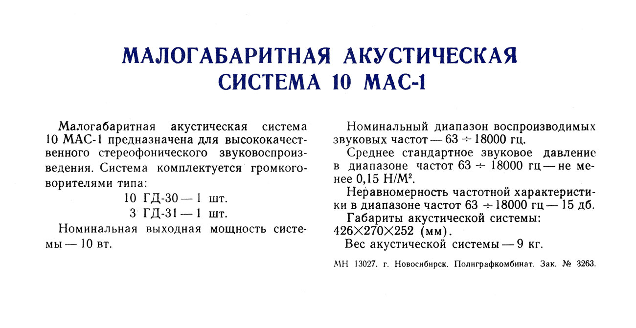 Акустическую компрессионную систему *10МАС-1* выпускали с 1972 года на Рижским ЭМЗ, Таллинском заводе *Пунане-РЭТ*, Бердском радиозаводе и Киевском заводе *Коммунист*. АС предназначены для высококачественого воспроизведения звуковых фонограмм. Входили в комплект электрофонов *Аккорд-001-стерео* и *Аккорд-101-стерео*, радиолы *Эстония-006 стерео*, продукции *Вега*. АС - двухполосная, состоит из деревянного закрытого корпуса, облицованного ценными породами дерева. Передняя панель закрыта радиотканью. В корпусе установлено два громкоговорителя 10ГД-30/Е (НЧ) и 3ГД-15М (ВЧ) включенных через RC-фильтр. Сопротивление АС 8 Ом. Номинальная подводимая мощность 10 Вт. Диапазон рабочих частот 80...12000 Гц. Габариты АС - 428х270х230 мм. Масса 8,2 кг. С 1973 года некоторыми заводами начат выпуск модернизированной АС *10МАС-1М*, где НЧ громкоговоритель 10ГД-30/Е заменён на 10ГД-30Б, а ВЧ головку 3ГД-15М заменили на 3ГД-31. Диапазон частот при этом расширился до 63...18000 Гц. Уменьшилась масса до 7,5 кг и габариты до 425x272x234 мм. *10МАС-1М* выпускалась Бердским радиозаводом и Киевским заводом *Коммунист*. Другими предприятиями ещё долго выпускались и *10МАС-1*. С 1979 года заводы выпускали АС типа *10АС-401*, модернизацию *10МАС-1М*. Здесь применены головки 20ГДН-1-8 и 5ГДВ-1-8. Параметры, оформление, габариты и вес остались прежними. С 1979 года Киевский завод *Коммунист* для магнитофона *Юпитер-203 стерео* выпускал АС *10АС-201* с максимальной мощностью 16 Вт и диапазоном частот 70...18000 Гц.