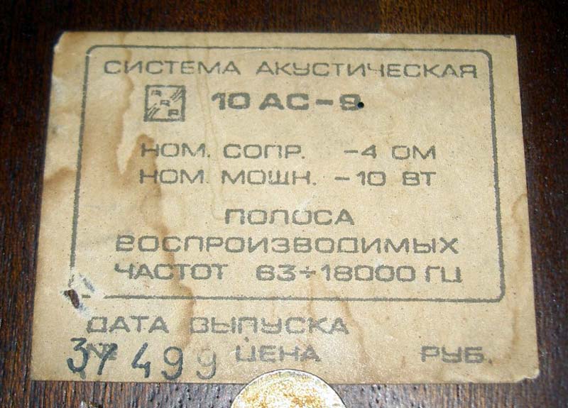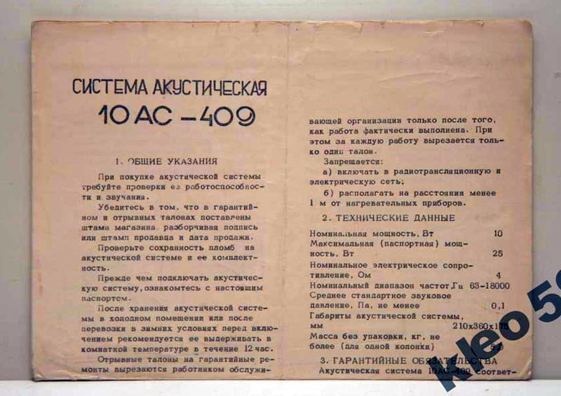 Акустическая двухполосная система с фазоинвертором *10АС-9* выпускалась с начала 1978 года Рижским радиозаводом им. А.С.Попова. АС входили в состав МЦ *Мелодия-106-стерео*. Корпус АС выполнен в виде прямоугольного неразборного ящика из ДСП, покрытым внешне натуральным шпоном. Спереди лицевая панель АС закрыта пластмассовой декоративной накладкой. НЧ динамик расположен в нижней части АС по центру вертикальной оси. ВЧ динамик находится над НЧ и сдвинут в левую сторону. Справа от ВЧ находится выход фазоинвертора. Внутри АС расположен электрический фильтр и звукопоглощающий материал. Диапазон воспроизводимых частот звука 63...18000 Гц. Чувствительность 85 дБ. Входное сопротивление 4 Ом. Номинальная мощность 10 Вт. Максимальная мощность 25 Вт. Используемые громкоговорители: НЧ/СЧ: 25 ГДН-1-4 (10 ГД-34). ВЧ: 6 ГДВ-1-16 (3 ГД-2). Габариты АС - 360х210х177 мм. Масса одной АС - 5 кг. С начала 1979 года АС именовались как *10АС-409*, с 1983 года как *10АС-209* и *10АС-408*.