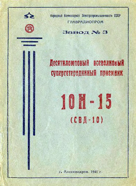 Радиоприёмник сетевой ламповый *10Н-15* (СВД-10) выпускал с января 1941 года Александровский радиозавод № 3 НКС. Радиоприёмник *10Н-15* (10-ти ламповый, Настольный, 15-й варианет разработки) первоначально именовался как *СВД-10*. Радиоприёмник построен по схеме супергетеродина и работает в 3-х диапазонах: Д - Длинные волны (715...2000 м), С - Средние волны (200...577 м) и К - Короткие волны (15,8...50 м) и имеет чувствительность 300...500 мкВ на всех диапазонах, избирательность по соседнему каналу около 30 дБ в ДВ, СВ диапазонах и 20 дБ в КВ диапазонах. Номинальная неискажённая выходная мощность усилителя 5, максимальная 6,5 Вт. Корпус радиоприёмника выполнен из древесины ценных пород, полирован. С января по март 1941 года было выпущено 500 радиоприёмников *10Н-15*. Выпуск радиоприёмника продолжался до середины 1941 года и был прекращён в связи с началом войны.