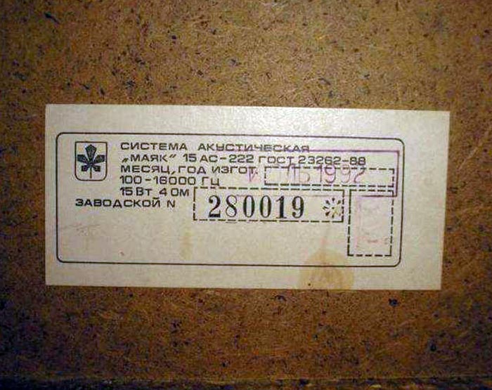 Акустические системы *Маяк 15АС-222* и *Маяк 15АС-222-1* с начала 1990 года выпускал Киевский завод *Маяк*. Широкополосная АС закрытого типа. Диапазон воспроизводимых звуковых частот 100...16000 Гц. Неравномерность АЧХ в диапазоне частот 100...16000 Гц - 14 дБ. Чувствительность 90 дБ. Сопротивление 4 Ом. Номинальная мощность 10 Вт. Долговременная мощность 15 Вт. Кратковременная мощность 20 Вт. Используемая динамическая головка 10 ГДШ-1-4. Внешние размеры АС 270х265х248 мм. Вес 4,5 кг. Этими АС комплектовали магнитофоны *Маяк М-240С-1* и некоторые другие.