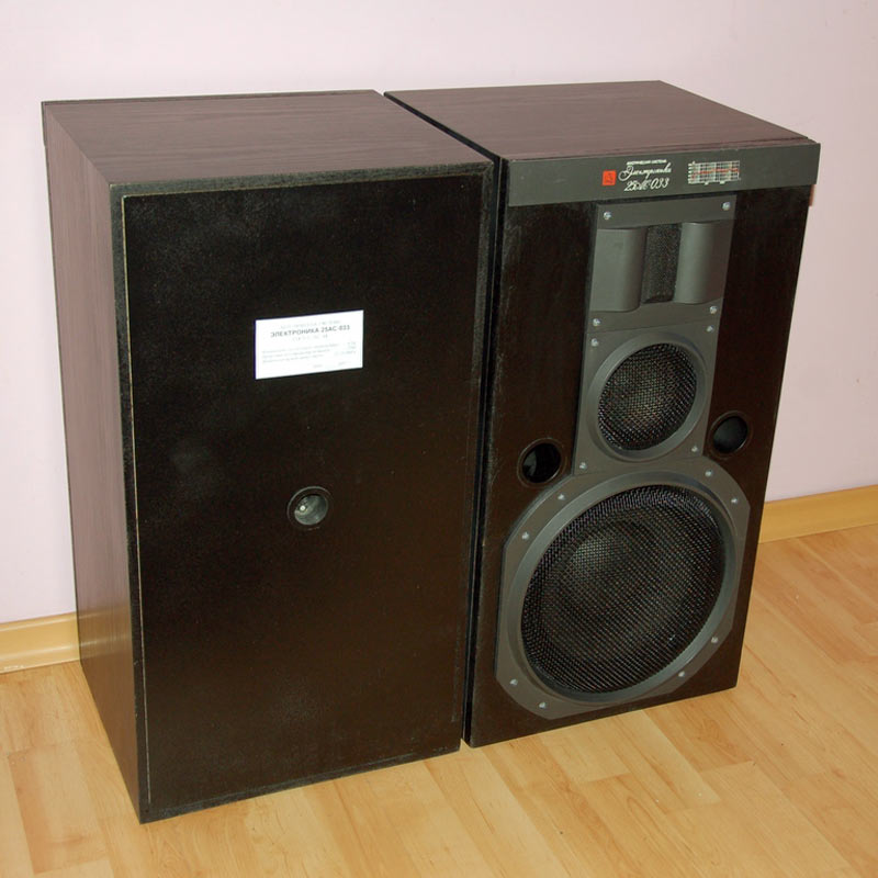 Трёхполосная акустическая система *Электроника 25АС-033* с 1986 года выпускал Ленинградский завод *Магнетон*. Бытовая АС с фазоинвертором **Электроника **25АС-033** предназначена для высококачественного воспроизведения музыкальных и речевых программ в стационарных условиях. Рекомендуемая выходная мощность применяемого усилителя 10...50 Вт. Предпочтительный вид установки для АС напольный. Диапазон эффективно воспроизводимых частот 25...31500 Гц. Гармонические искажения во всей полосе рабочих частот 1...2 %. Кратковременная допустимая мощность 75 Вт. Пиковая мощность 100 Вт. Габариты АС - 320х610325 мм. Масса 21 кг.