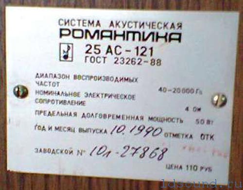 Акустическая система *25АС-121* (Романтика) выпускалась с 1986 года Харьковским заводом имени Шевченко. АС входили в комплект магниторадиолы *Романтика РЭМ-120-1С*. Применённые громкоговорители: НЧ 35ГДН-1М-4, СЧ 20ГДС-1М-8, ВЧ 6ГДВ-6М-16. Трёхполосная АС. Диапазон частот - 40...20000 Гц. Номинальная мощность:25 Вт. Предельная долговременная мощность 50 Вт. Кратковременная мощность 115 Вт. Сопротивление: 4 Ом. Габариты АС 530х330х263 мм. Масса 16 кг.