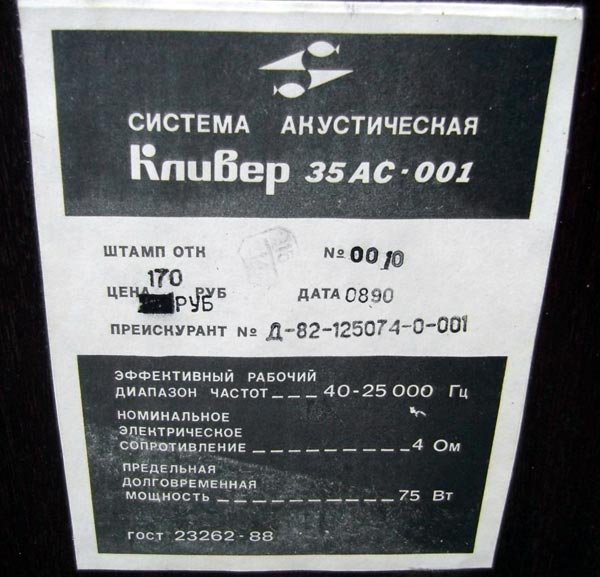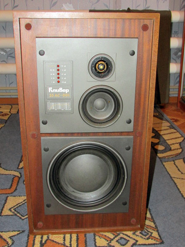Акустическая система *35АС-001* (Кливер) выпускалась с 1990 года Краснолучинским заводом *Красный луч*. 3-х полосная АС *35АС-001* (Кливер) предназначена для высококачественного воспроизведения звука в составе комплекта бытовой радиоэлектронной аппаратуры. Параметры: Диапазон воспроизводимых частот звука: 40...25000 Гц. Чувствительность в диапазоне 100...8000 Гц - 85,5 дБ. Сопротивление 4 Ом. Полный характеристический коэффициент гармонических искажений при уровне среднего звукового давления в диапазоне частот 100...8000 Гц, равном 90 дБ, измеряемый в диапазонах частот: 250...1000 Гц: 1,5%. 1000...2000 Гц: 1,5%. 2000...6300 Гц: 1%. Различие частотных характеристик звукового давления систем одного типа, усредненных в октавных полосах частот в диапазоне 250...8000 Гц: 2 дБ. Долговременная подводимая мощность: 75 Вт. Шумовая мощность: 75 Вт. Кратковременная мощность: 150 Вт. Габариты АС - 715х395х365 мм. Масса 32 кг.