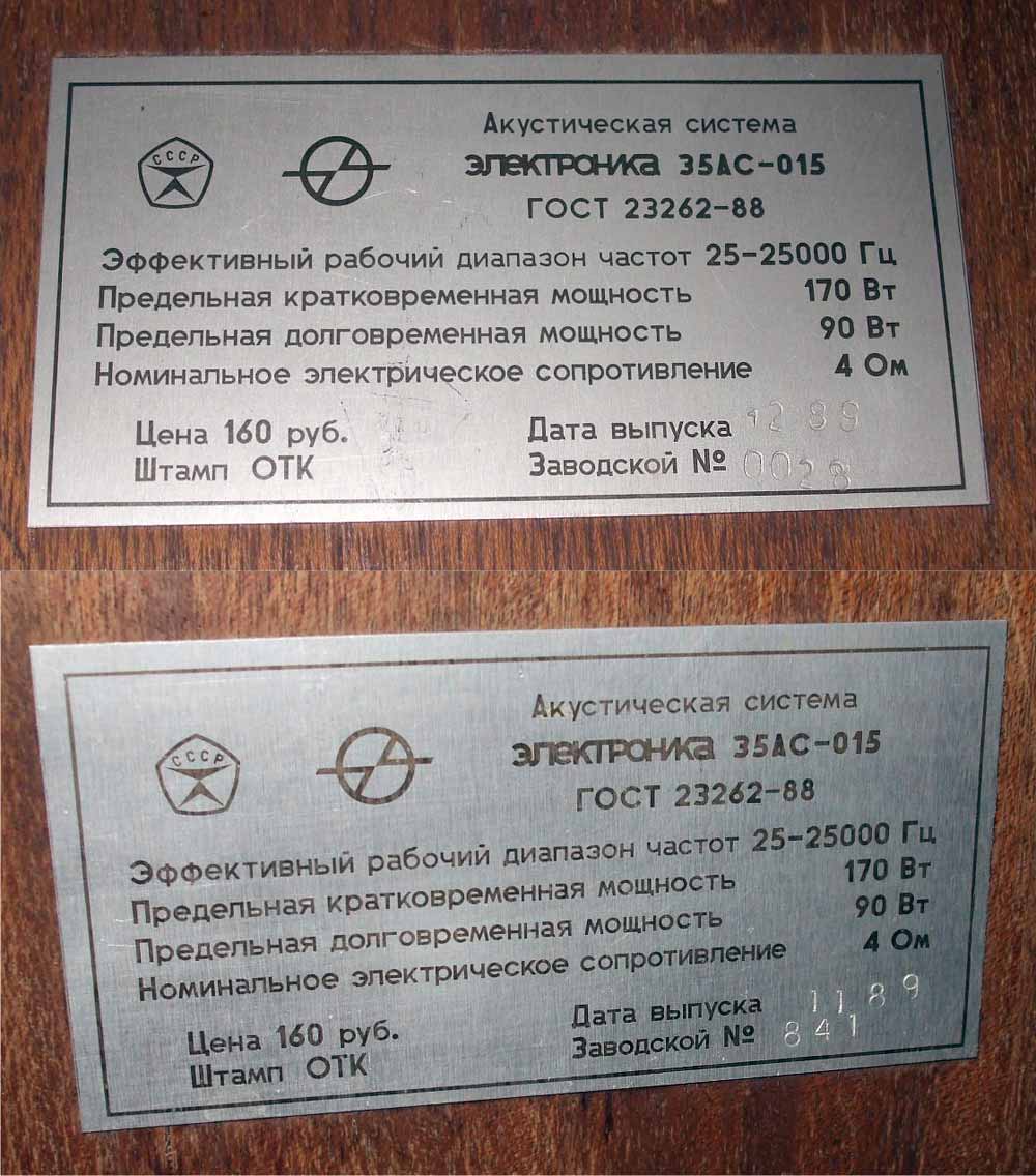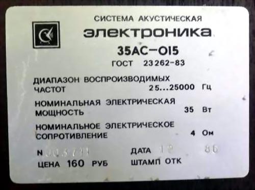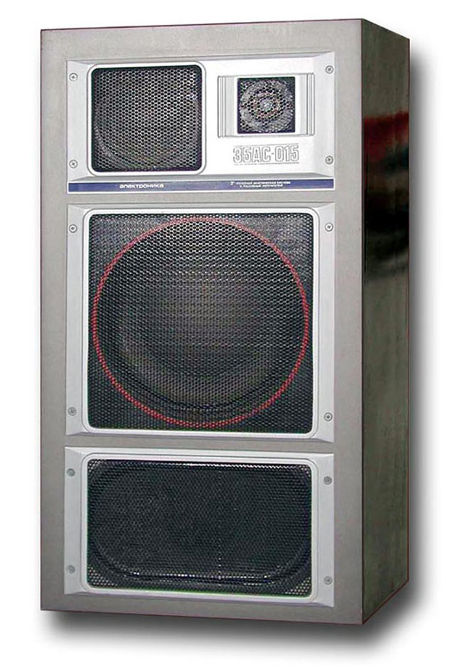 Акустическая система *Электроника 35АС-015* с I-кв 1985 года выпускали ВНПК *Акустика*, Учкекенсий завод *Микрокомпонент*, Зеленчукский завод *Спираль* и Казанский завод ЭВМ. АС предназначена для высококачественного воспроизведения музыкальных и речевых фонограмм. Рекомендуемая мощность высококачественного усилителя ЗЧ от 20 до 130 Вт. АС предназначена для установки на полу. Диапазон воспроизводимых частот - 25...25000 Гц. Неравномерность АЧХ 5%. Сопротивление 4 Ома. Номинальная мощность 25 Вт, долговременная 130 Вт. Габариты АС - 355х685х305. Масса 27 кг.