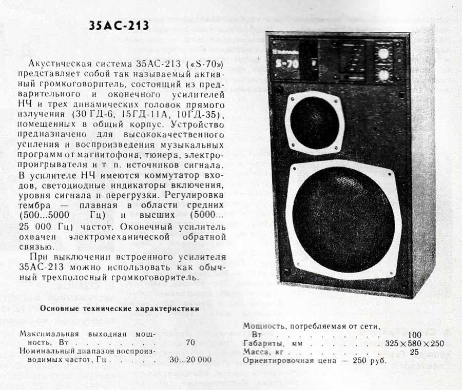 Активная аустическая система *35АС-213* (S-70) выпускалась с осени 1980 года Рижским радиозаводом имени Попова. АС предназначена для высококачественного воспроизведения звуковых фонограмм. АС состоит из встроенного усилителя ЗЧ с ЭМОС и трёх громкоговорителей прямого излучения. В УЗЧ имеются регуляторы тембра по СЧ и ВЧ. При выключении усилителя АС можно использовать как пассивный трёхполосный громкоговорнитель. Внизу реклама АС в Радио №5,6 за 1981 г.