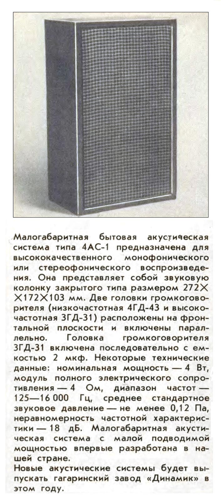 Малогабаритная акустическая система *4АС-1* выпускалась с 1975 года Гагаринским заводом *Динамик*. Малогабаритная бытовая акустическая система типа *4АС-1* предназначена для высококачественного монофонического или стереофонического воспроизведения звуковых фонограмм. Она представляет собой звуковую колонку закрытого типа размером 272х172х103 мм. Две головки громкоговорителя (низкочастотная 4ГД-43 и высокочастотная 3ГД-31) расположены на фронтальной плоскости и включены параллельно. Головка громкоговорителя 3ГД-31 включена последовательно с ёмкостью 2 мкф. Некоторые технические данные: номинальная мощность - 4 Вт, модуль полного электрического сопротивления - 4 Ом, диапазон воспроизводимых частот - 125...16000 Гц, среднее стандартное звуковое давление - не менее 0,12 Па, неравномерность частотной характеристики - 18 дБ. Малогабаритная акустическая система с малой подводимой мощностью впервые разработана нашей страной.