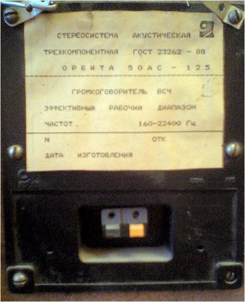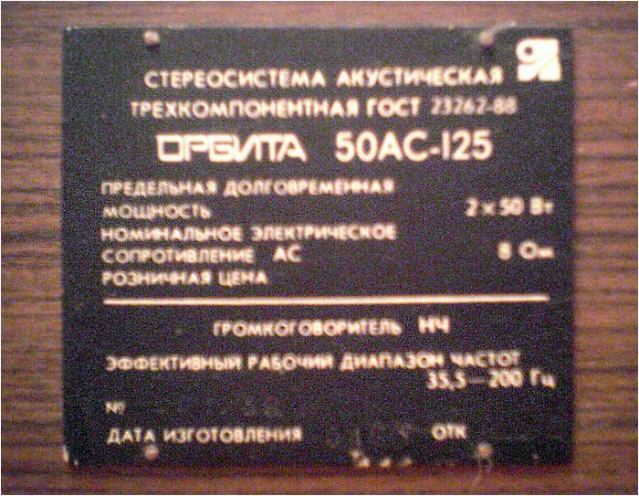 Акустическая система *Орбита 50АС-125* выпускалась с начала 1989 года. **Орбита 50АС-125** трехполосная стереофоническая АС, состоящая из одного низкочастотного и 2-х средне-высокочастотных громкоговорителей. Корпус НЧ громкоговорителя выполнен в виде мебельной тумбы на колесах которую можно использовать в качестве подставки под радиоаппаратуру. Две низкочастотные головки 35ГДН-1-8 размещены коаксиально, что позволило повысить эффективность воспроизведения НЧ, снизить нелинейные и переходные искажения. Средне-высокочастотные громкоговорители представляют собой ящики облегченной конструкции, в каждом из которых размещено по две головки: 20ГДС-1-8 и 6ГДВ-6-16. Основные технические характеристики. Номинальная мощность НЧ громкоговорителя 50, СЧ и ВЧ 2х15 Вт, номинальный диапазон воспроизводимых частот соответвенно 35...200 и 160...22400 Гц, уровень характеристической чувствительности -88 и 89 дБ/Вт/м; суммарный характеристический коэффициент гармоник АС в диапазоне 50...1000 Гц - 2, 1000...2000 Гц - 1,5 и 2000...22 400 Гц - 1%; габариты АС НЧ - 520х460х400, СЧ-ВЧ - 260х150х145 мм; вес 28 и 3,5 кг. Цена комплекта 200 рублей.